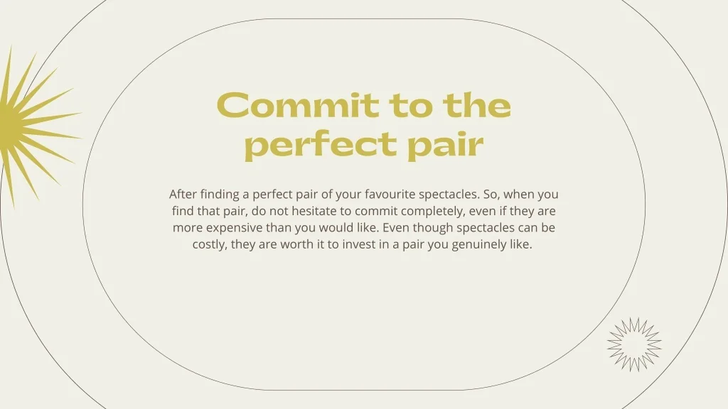Commit to the perfect pair After finding a perfect pair of your favourite spectacles. So, when you find that pair, do not hesitate to commit completely, even if they are more expensive than you would like. Even though spectacles can be costly, they are worth it to invest in a pair you genuinely like.