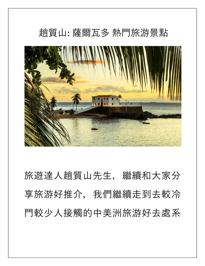 趙質山: 薩爾瓦多熱門旅游景點 旅遊達人趙質山先生,繼續和大家分 享旅游好推介,我們繼續走到去較冷 門較少人接觸的中美洲旅游好去處系