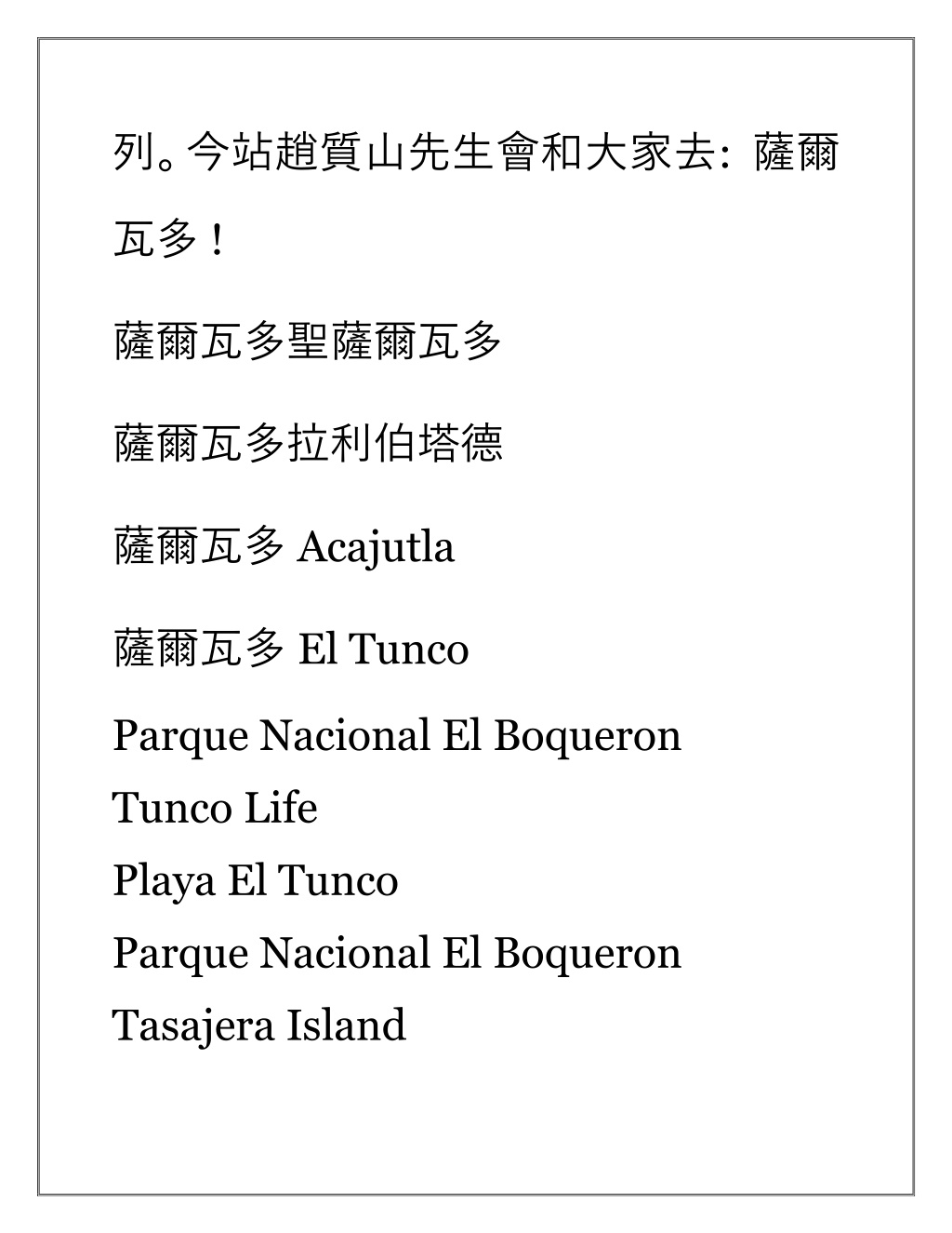 列。今站趙質山先生會和大家去: 薩爾 瓦多 ! 薩爾瓦多聖薩爾瓦多 薩爾瓦多拉利伯塔德 薩爾瓦多 Acajutla 薩爾瓦多 El Tunco Parque Nacional El Boqueron Tunco Life Playa El Tunco Parque Nacional El Boqueron Tasajera Island