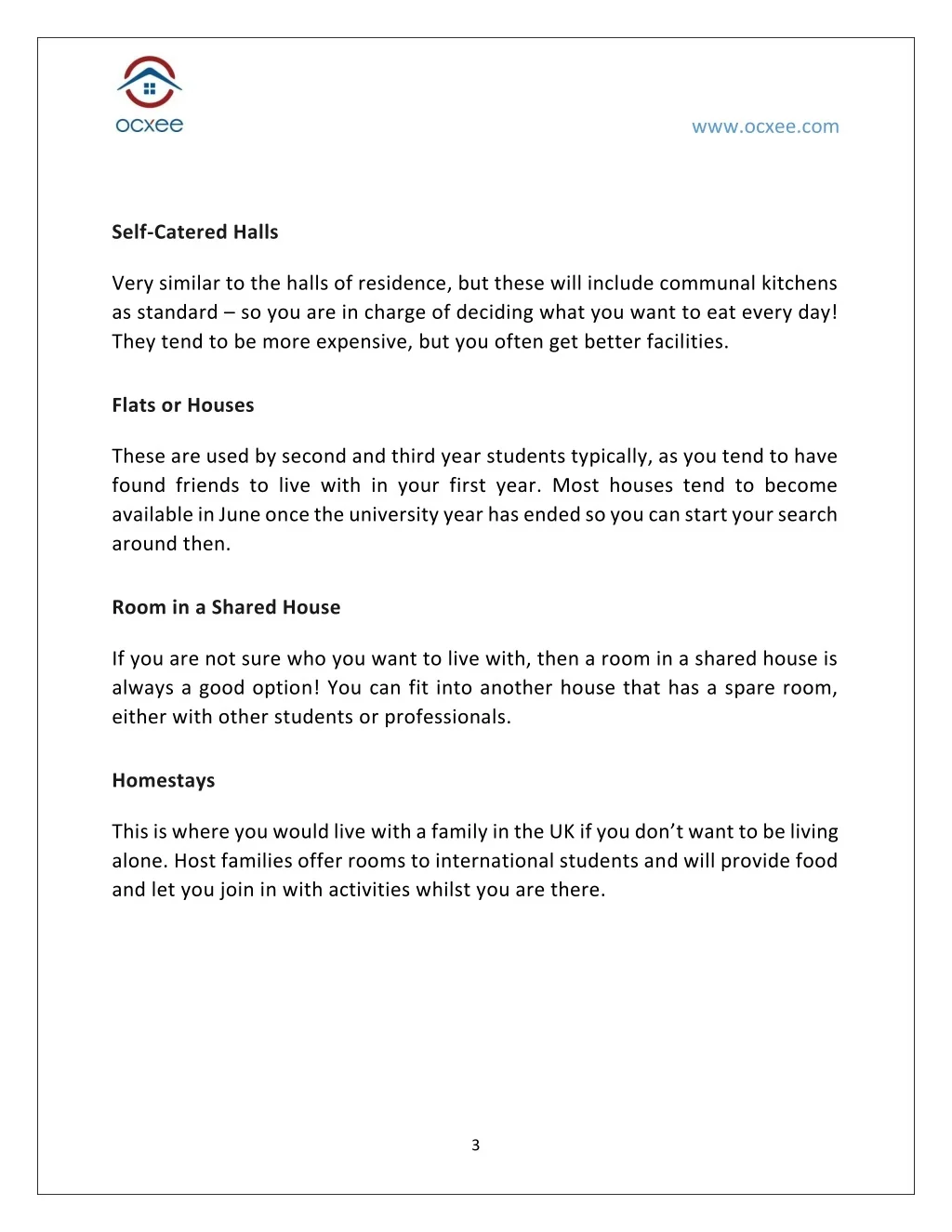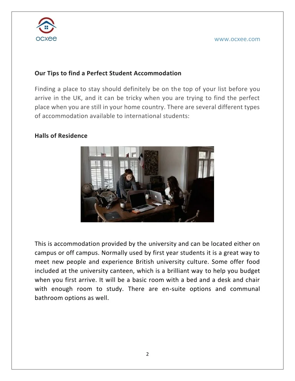 www.ocxee.com Our Tips to find a Perfect Student Accommodation Finding a place to stay should definitely be on the top of your list before you arrive in the UK, and it can be tricky when you are trying to find the perfect place when you are still in your home country. There are several different types of accommodation available to international students: Halls of Residence This is accommodation provided by the university and can be located either on campus or off campus. Normally used by first year students it is a great way to meet new people and experience British university culture. Some offer food included at the university canteen, which is a brilliant way to help you budget when you first arrive. It will be a basic room with a bed and a desk and chair with enough room to study. There are en-suite options and communal bathroom options as well. 2