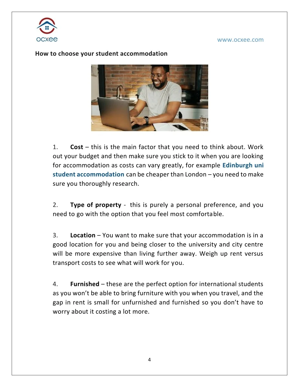 www.ocxee.com How to choose your student accommodation 1. out your budget and then make sure you stick to it when you are looking for accommodation as costs can vary greatly, for example Edinburgh uni student accommodation can be cheaper than London – you need to make sure you thoroughly research. Cost– this is the main factor that you need to think about. Work 2. need to go with the option that you feel most comfortable. Type of property - this is purely a personal preference, and you 3. good location for you and being closer to the university and city centre will be more expensive than living further away. Weigh up rent versus transport costs to see what will work for you. Location– You want to make sure that your accommodation is in a 4. as you won’t be able to bring furniture with you when you travel, and the gap in rent is small for unfurnished and furnished so you don’t have to worry about it costing a lot more. Furnished – these are the perfect option for international students 4