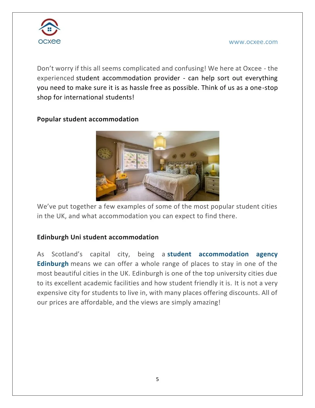 www.ocxee.com Don’t worry if this all seems complicated and confusing! We here at Oxcee - the experienced student accommodation provider - can help sort out everything you need to make sure it is as hassle free as possible. Think of us as a one-stop shop for international students! Popular student accommodation We’ve put together a few examples of some of the most popular student cities in the UK, and what accommodation you can expect to find there. Edinburgh Uni student accommodation As Scotland’s capital city, being astudent accommodation agency Edinburgh means we can offer a whole range of places to stay in one of the most beautiful cities in the UK. Edinburgh is one of the top university cities due to its excellent academic facilities and how student friendly it is. It is not a very expensive city for students to live in, with many places offering discounts. All of our prices are affordable, and the views are simply amazing! 5