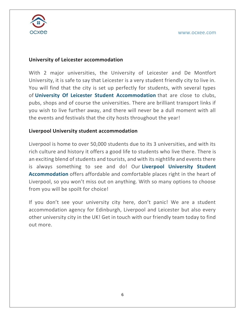 www.ocxee.com University of Leicester accommodation With 2 major universities, the University of Leicester and De Montfort University, it is safe to say that Leicester is a very student friendly city to live in. You will find that the city is set up perfectly for students, with several types of University Of Leicester Student Accommodation that are close to clubs, pubs, shops and of course the universities. There are brilliant transport links if you wish to live further away, and there will never be a dull moment with all the events and festivals that the city hosts throughout the year! Liverpool University student accommodation Liverpool is home to over 50,000 students due to its 3 universities, and with its rich culture and history it offers a good life to students who live there. There is an exciting blend of students and tourists, and with its nightlife and events there is always something to see and do! Our Liverpool University Student Accommodation offers affordable and comfortable places right in the heart of Liverpool, so you won’t miss out on anything. With so many options to choose from you will be spoilt for choice! If you don’t see your university city here, don’t panic! We are a student accommodation agency for Edinburgh, Liverpool and Leicester but also every other university city in the UK! Get in touch with our friendly team today to find out more. 6