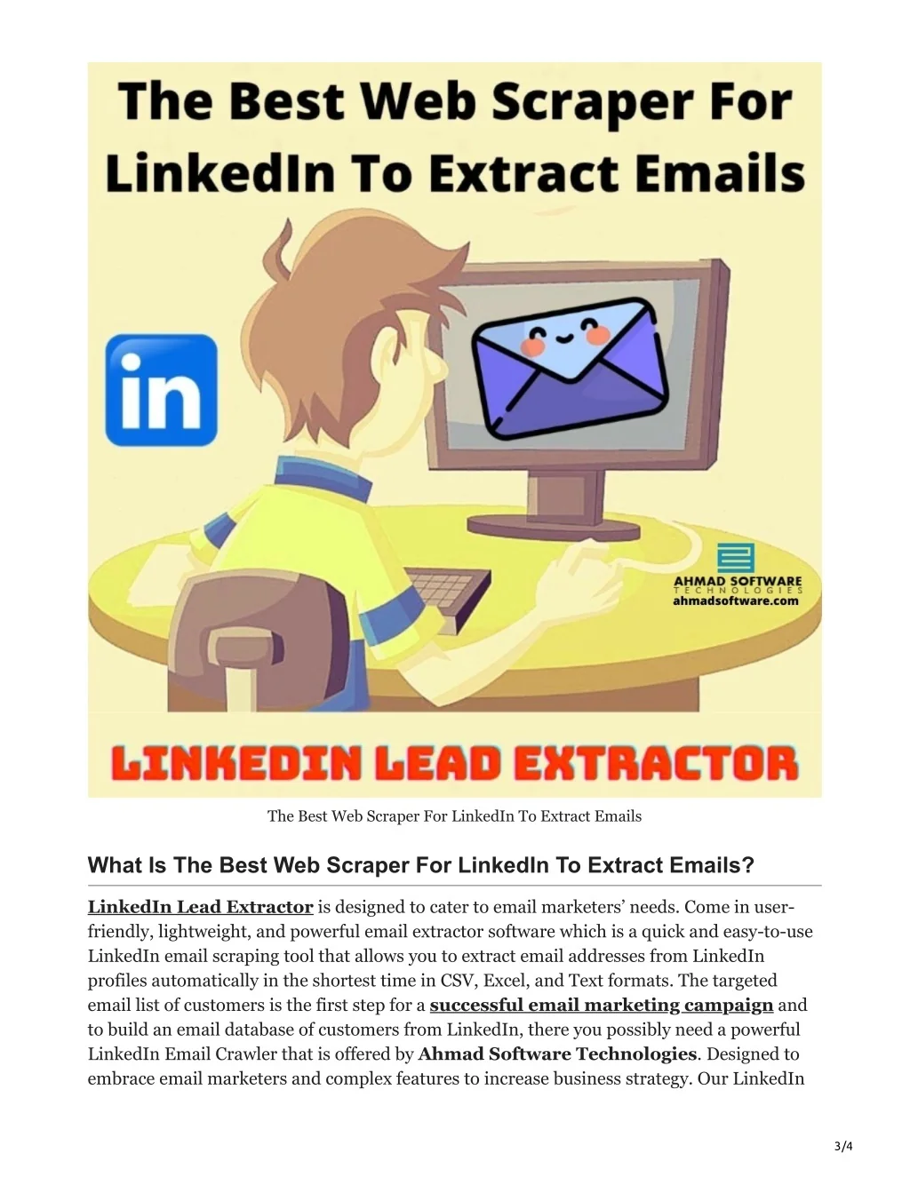 The Best Web Scraper For LinkedIn To Extract Emails What Is The Best Web Scraper For LinkedIn To Extract Emails? LinkedIn Lead Extractor is designed to cater to email marketers’ needs. Come in user- friendly, lightweight, and powerful email extractor software which is a quick and easy-to-use LinkedIn email scraping tool that allows you to extract email addresses from LinkedIn profiles automatically in the shortest time in CSV, Excel, and Text formats. The targeted email list of customers is the first step for a successful email marketing campaign and to build an email database of customers from LinkedIn, there you possibly need a powerful LinkedIn Email Crawler that is offered by Ahmad Software Technologies. Designed to embrace email marketers and complex features to increase business strategy. Our LinkedIn 3/4