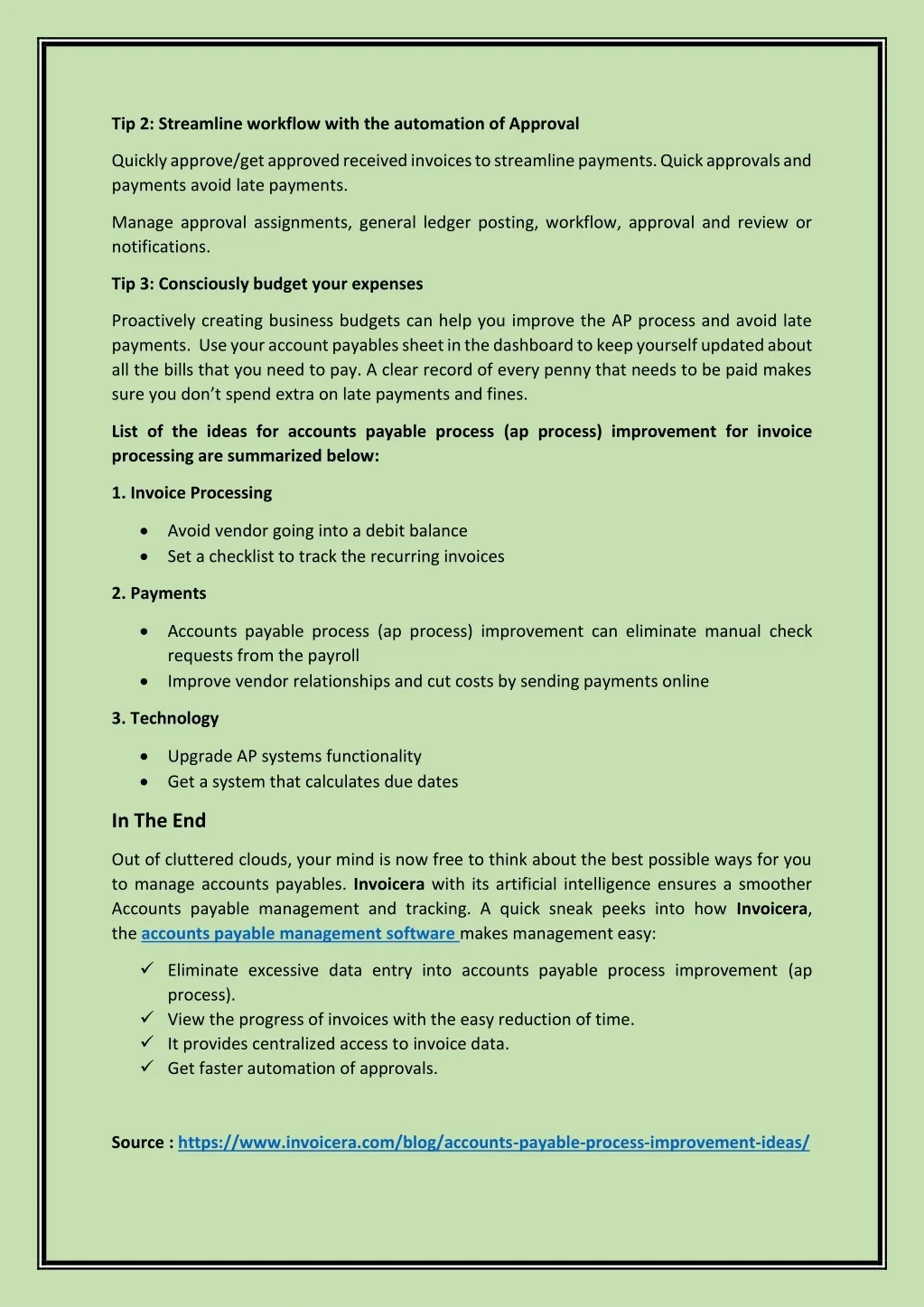 Tip 2: Streamline workflow with the automation of Approval Quickly approve/get approved received invoices to streamline payments. Quick approvals and payments avoid late payments. Manage approval assignments, general ledger posting, workflow, approval and review or notifications. Tip 3: Consciously budget your expenses Proactively creating business budgets can help you improve the AP process and avoid late payments. Use your account payables sheet in the dashboard to keep yourself updated about all the bills that you need to pay. A clear record of every penny that needs to be paid makes sure you don’t spend extra on late payments and fines. List of the ideas for accounts payable process (ap process) improvement for invoice processing are summarized below: 1. Invoice Processing •Avoid vendor going into a debit balance •Set a checklist to track the recurring invoices 2. Payments •Accounts payable process (ap process) improvement can eliminate manual check requests from the payroll •Improve vendor relationships and cut costs by sending payments online 3. Technology •Upgrade AP systems functionality •Get a system that calculates due dates In The End Out of cluttered clouds, your mind is now free to think about the best possible ways for you to manage accounts payables. Invoicera with its artificial intelligence ensures a smoother Accounts payable management and tracking. A quick sneak peeks into how Invoicera, the accounts payable management software makes management easy: ✓Eliminate excessive data entry into accounts payable process improvement (ap process). ✓View the progress of invoices with the easy reduction of time. ✓It provides centralized access to invoice data. ✓Get faster automation of approvals. Source : https://www.invoicera.com/blog/accounts-payable-process-improvement-ideas/
