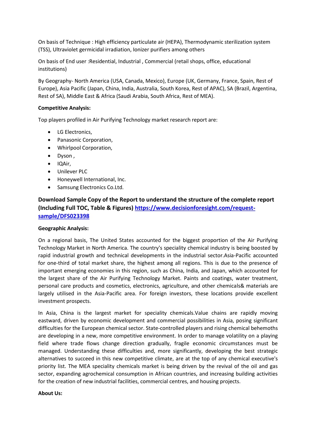 On basis of Technique : High efficiency particulate air (HEPA), Thermodynamic sterilization system (TSS), Ultraviolet germicidal irradiation, Ionizer purifiers among others On basis of End user :Residential, Industrial , Commercial (retail shops, office, educational institutions) By Geography- North America (USA, Canada, Mexico), Europe (UK, Germany, France, Spain, Rest of Europe), Asia Pacific (Japan, China, India, Australia, South Korea, Rest of APAC), SA (Brazil, Argentina, Rest of SA), Middle East & Africa (Saudi Arabia, South Africa, Rest of MEA). Competitive Analysis: Top players profiled in Air Purifying Technology market research report are: LG Electronics, Panasonic Corporation, Whirlpool Corporation, Dyson , IQAir, Unilever PLC Honeywell International, Inc. Samsung Electronics Co.Ltd. Download Sample Copy of the Report to understand the structure of the complete report (Including Full TOC, Table & Figures)https://www.decisionforesight.com/request- sample/DFS023398 Geographic Analysis: On a regional basis, The United States accounted for the biggest proportion of the Air Purifying Technology Market in North America. The country's speciality chemical industry is being boosted by rapid industrial growth and technical developments in the industrial sector.Asia-Pacific accounted for one-third of total market share, the highest among all regions. This is due to the presence of important emerging economies in this region, such as China, India, and Japan, which accounted for the largest share of the Air Purifying Technology Market. Paints and coatings, water treatment, personal care products and cosmetics, electronics, agriculture, and other chemicals& materials are largely utilised in the Asia-Pacific area. For foreign investors, these locations provide excellent investment prospects. In Asia, China is the largest market for speciality chemicals.Value chains are rapidly moving eastward, driven by economic development and commercial possibilities in Asia, posing significant difficulties for the European chemical sector. State-controlled players and rising chemical behemoths are developing in a new, more competitive environment. In order to manage volatility on a playing field where trade flows change direction gradually, fragile economic circumstances must be managed. Understanding these difficulties and, more significantly, developing the best strategic alternatives to succeed in this new competitive climate, are at the top of any chemical executive's priority list. The MEA speciality chemicals market is being driven by the revival of the oil and gas sector, expanding agrochemical consumption in African countries, and increasing building activities for the creation of new industrial facilities, commercial centres, and housing projects. About Us: