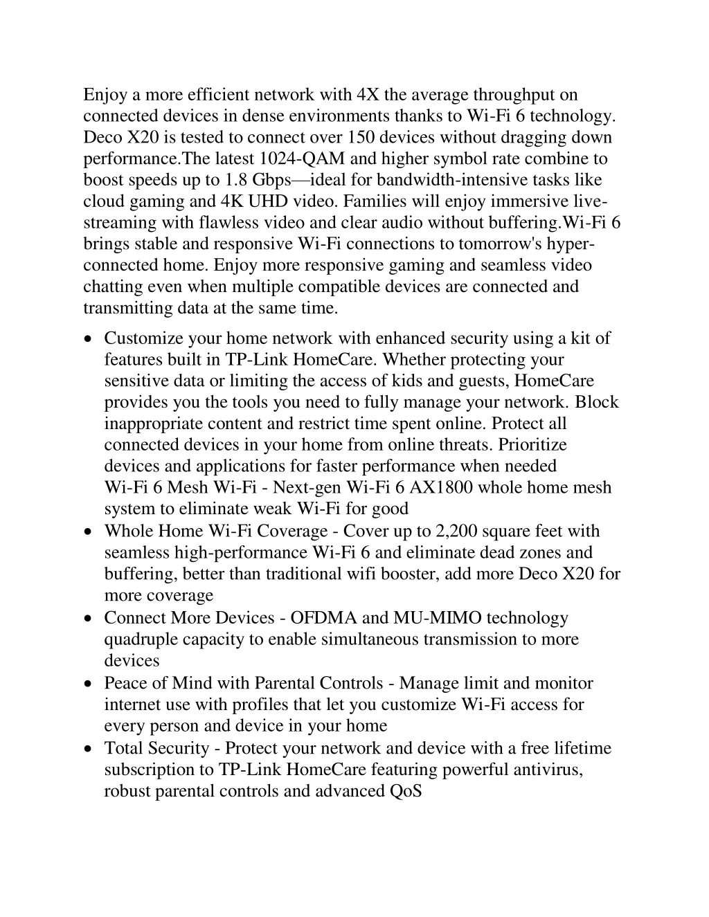Enjoy a more efficient network with 4X the average throughput on connected devices in dense environments thanks to Wi-Fi 6 technology. Deco X20 is tested to connect over 150 devices without dragging down performance.The latest 1024-QAM and higher symbol rate combine to boost speeds up to 1.8 Gbps—ideal for bandwidth-intensive tasks like cloud gaming and 4K UHD video. Families will enjoy immersive live- streaming with flawless video and clear audio without buffering.Wi-Fi 6 brings stable and responsive Wi-Fi connections to tomorrow's hyper- connected home. Enjoy more responsive gaming and seamless video chatting even when multiple compatible devices are connected and transmitting data at the same time. Customize your home network with enhanced security using a kit of features built in TP-Link HomeCare. Whether protecting your sensitive data or limiting the access of kids and guests, HomeCare provides you the tools you need to fully manage your network. Block inappropriate content and restrict time spent online. Protect all connected devices in your home from online threats. Prioritize devices and applications for faster performance when needed Wi-Fi 6 Mesh Wi-Fi - Next-gen Wi-Fi 6 AX1800 whole home mesh system to eliminate weak Wi-Fi for good Whole Home Wi-Fi Coverage - Cover up to 2,200 square feet with seamless high-performance Wi-Fi 6 and eliminate dead zones and buffering, better than traditional wifi booster, add more Deco X20 for more coverage Connect More Devices - OFDMA and MU-MIMO technology quadruple capacity to enable simultaneous transmission to more devices Peace of Mind with Parental Controls - Manage limit and monitor internet use with profiles that let you customize Wi-Fi access for every person and device in your home Total Security - Protect your network and device with a free lifetime subscription to TP-Link HomeCare featuring powerful antivirus, robust parental controls and advanced QoS