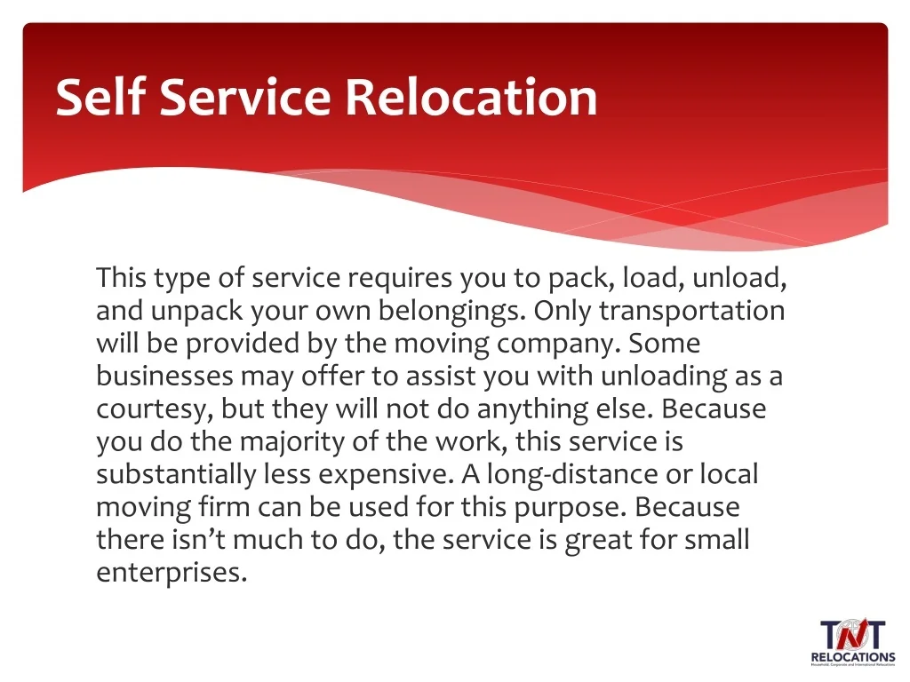 Self Service Relocation This type of service requires you to pack, load, unload, and unpack your own belongings. Only transportation will be provided by the moving company. Some businesses may offer to assist you with unloading as a courtesy, but they will not do anything else. Because you do the majority of the work, this service is substantially less expensive. A long-distance or local moving firm can be used for this purpose. Because there isn’t much to do, the service is great for small enterprises.