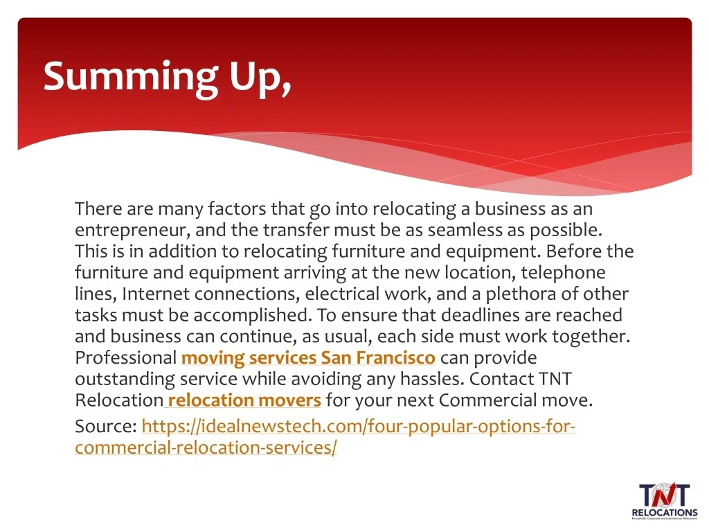 Summing Up, There are many factors that go into relocating a business as an entrepreneur, and the transfer must be as seamless as possible. This is in addition to relocating furniture and equipment. Before the furniture and equipment arriving at the new location, telephone lines, Internet connections, electrical work, and a plethora of other tasks must be accomplished. To ensure that deadlines are reached and business can continue, as usual, each side must work together. Professional moving services San Francisco can provide outstanding service while avoiding any hassles. Contact TNT Relocationrelocationmoversfor your next Commercial move. Source: https://idealnewstech.com/four-popular-options-for-commercial-relocation-services/