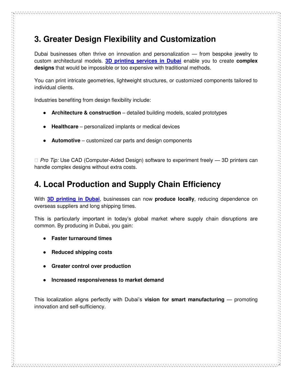 3. Greater Design Flexibility and Customization Dubai businesses often thrive on innovation and personalization — from bespoke jewelry to custom architectural models. 3D printing services in Dubai enable you to create complex designs that would be impossible or too expensive with traditional methods. You can print intricate geometries, lightweight structures, or customized components tailored to individual clients. Industries benefiting from design flexibility include: ●Architecture & construction– detailed building models, scaled prototypes ●Healthcare– personalized implants or medical devices ●Automotive– customized car parts and design components Pro Tip: Use CAD (Computer-Aided Design) software to experiment freely — 3D printers can handle complex designs without extra costs. 4. Local Production and Supply Chain Efficiency With 3D printing in Dubai, businesses can now produce locally, reducing dependence on overseas suppliers and long shipping times. This is particularly important in today’s global market where supply chain disruptions are common. By producing in Dubai, you gain: ●Faster turnaround times ●Reduced shipping costs ●Greater control over production ●Increased responsiveness to market demand This localization aligns perfectly with Dubai’s vision for smart manufacturing— promoting innovation and self-sufficiency.