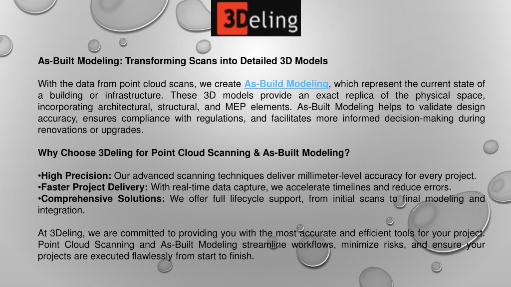 2. As-Built Modeling: Transforming Scans into Detailed 3D Models • With the data from point cloud scans, we create As-Build Modeling, which represent the current state of a building or infrastructure. These 3D models provide an exact replica of the physical space, incorporating architectural, structural, and MEP elements. As-Built Modeling helps to validate design accuracy, ensures compliance with regulations, and facilitates more informed decision-making during renovations or upgrades. • Why Choose 3Deling for Point Cloud Scanning & As-Built Modeling? • High Precision: Our advanced scanning techniques deliver millimeter-level accuracy for every project. • Faster Project Delivery: With real-time data capture, we accelerate timelines and reduce errors. • Comprehensive Solutions: We offer full lifecycle support, from initial scans to final modeling and integration. • At 3Deling, we are committed to providing you with the most accurate and efficient tools for your project. Point Cloud Scanning and As-Built Modeling streamline workflows, minimize risks, and ensure your projects are executed flawlessly from start to finish.