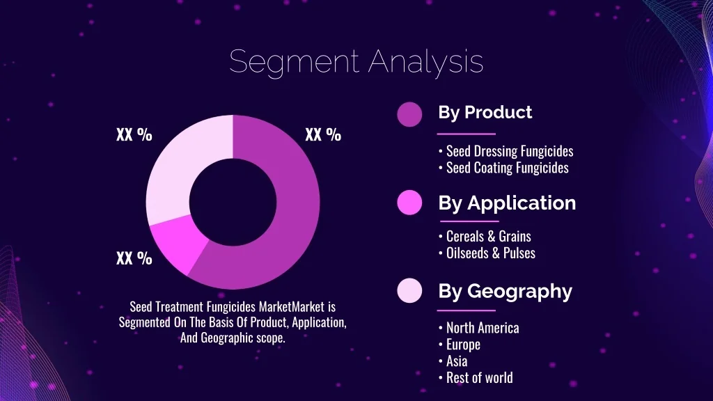 Segment Analysis • By Product XX % XX % • • Seed Dressing Fungicides • • Seed Coating Fungicides • By Application • • Cereals & Grains • • Oilseeds & Pulses XX % • By Geography • Seed Treatment Fungicides MarketMarketis Segmented On The Basis Of Product, Application, And Geographic scope. • • North America • • Europe • • Asia • • Rest of world