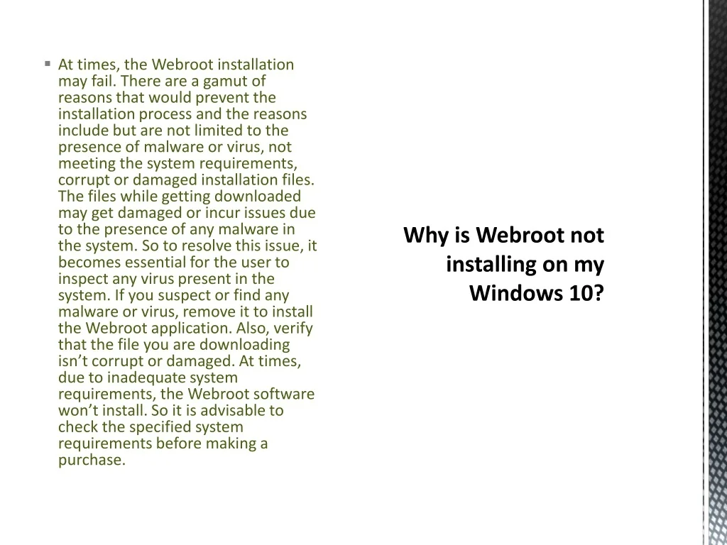 At times, the Webroot installation may fail. There are a gamut of reasons that would prevent the installation process and the reasons include but are not limited to the presence of malware or virus, not meeting the system requirements, corrupt or damaged installation files. The files while getting downloaded may get damaged or incur issues due to the presence of any malware in the system. So to resolve this issue, it becomes essential for the user to inspect any virus present in the system. If you suspect or find any malware or virus, remove it to install the Webroot application. Also, verify that the file you are downloading isn’t corrupt or damaged. At times, due to inadequate system requirements, the Webroot software won’t install. So it is advisable to check the specified system requirements before making a purchase. Why is Webroot not installing on my Windows 10?
