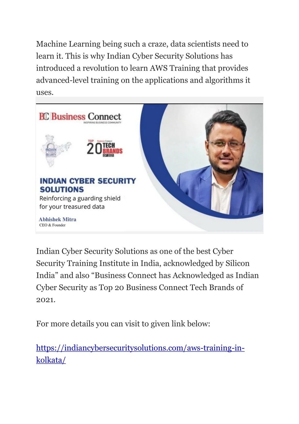 Machine Learning being such a craze, data scientists need to learn it. This is why Indian Cyber Security Solutions has introduced a revolution to learn AWS Training that provides advanced-level training on the applications and algorithms it uses. Indian Cyber Security Solutions as one of the best Cyber Security Training Institute in India, acknowledged by Silicon India” and also “Business Connect has Acknowledged as Indian Cyber Security as Top 20 Business Connect Tech Brands of 2021. For more details you can visit to given link below: https://indiancybersecuritysolutions.com/aws-training-in- kolkata/