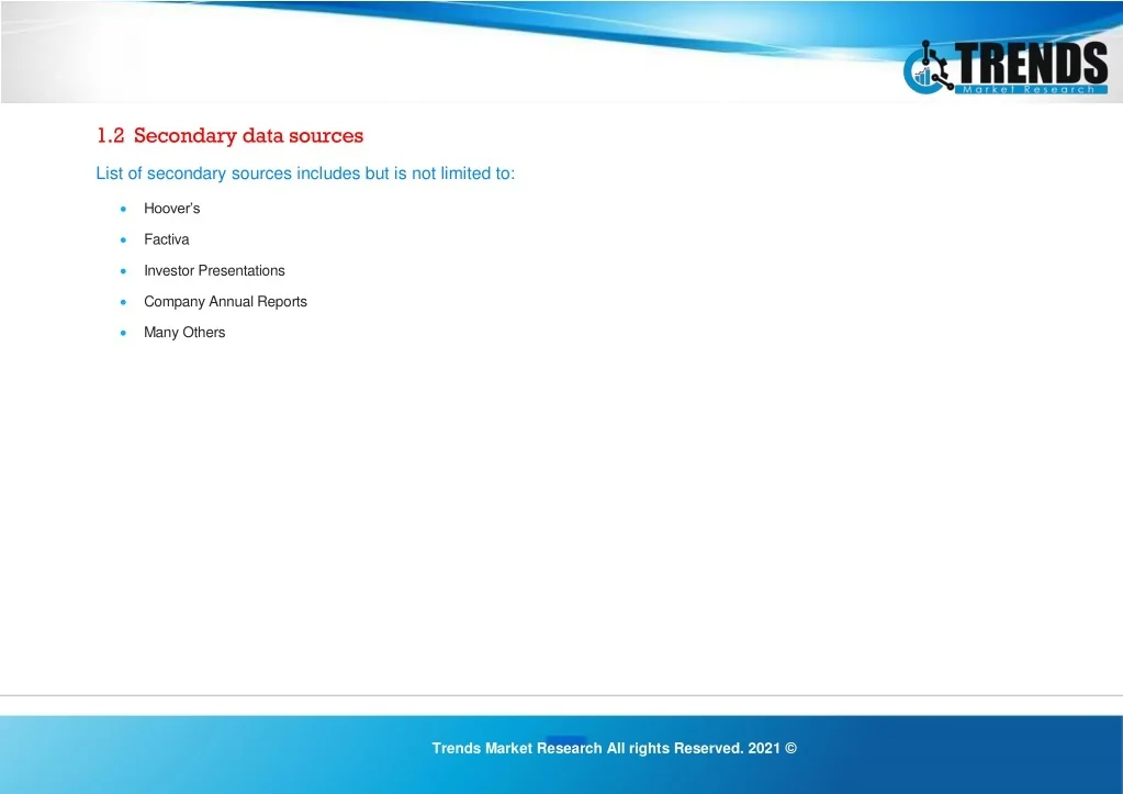 1.2Secondary data sources List of secondary sources includes but is not limited to: Hoover’s Factiva Investor Presentations Company Annual Reports Many Others Trends Market Research All rights Reserved. 2021 ©