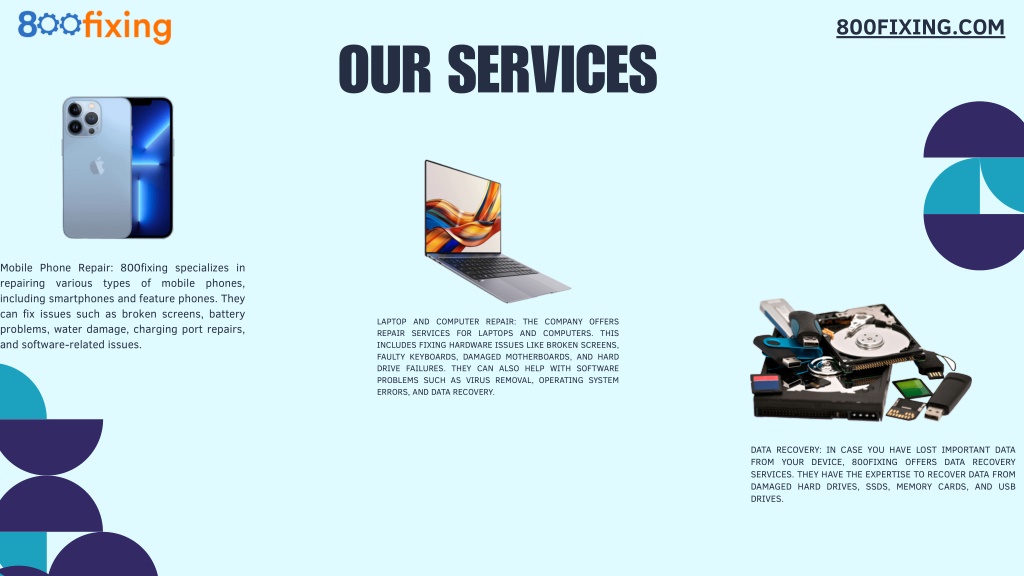 800FIXING.COM OUR SERVICES Mobile Phone Repair: 800fixing specializes in repairing various types of mobile phones, including smartphones and feature phones. They can fix issues such as broken screens, battery problems, water damage, charging port repairs, and software-related issues. LAPTOP AND COMPUTER REPAIR: THE COMPANY OFFERS REPAIR SERVICES FOR LAPTOPS AND COMPUTERS. THIS INCLUDES FIXING HARDWARE ISSUES LIKE BROKEN SCREENS, FAULTY KEYBOARDS, DAMAGED MOTHERBOARDS, AND HARD DRIVE FAILURES. THEY CAN ALSO HELP WITH SOFTWARE PROBLEMS SUCH AS VIRUS REMOVAL, OPERATING SYSTEM ERRORS, AND DATA RECOVERY. DATA RECOVERY: IN CASE YOU HAVE LOST IMPORTANT DATA FROM YOUR DEVICE, 800FIXING OFFERS DATA RECOVERY SERVICES. THEY HAVE THE EXPERTISE TO RECOVER DATA FROM DAMAGED HARD DRIVES, SSDS, MEMORY CARDS, AND USB DRIVES.