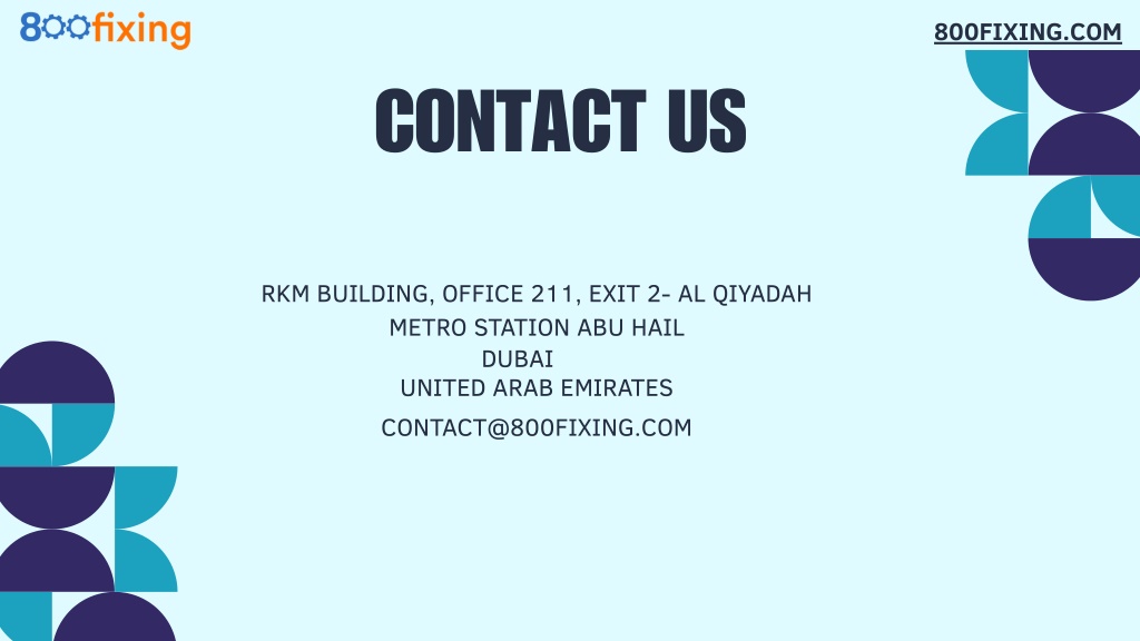 800FIXING.COM CONTACT US RKM BUILDING, OFFICE 211, EXIT 2- AL QIYADAH METRO STATION ABU HAIL DUBAI UNITED ARAB EMIRATES CONTACT@800FIXING.COM