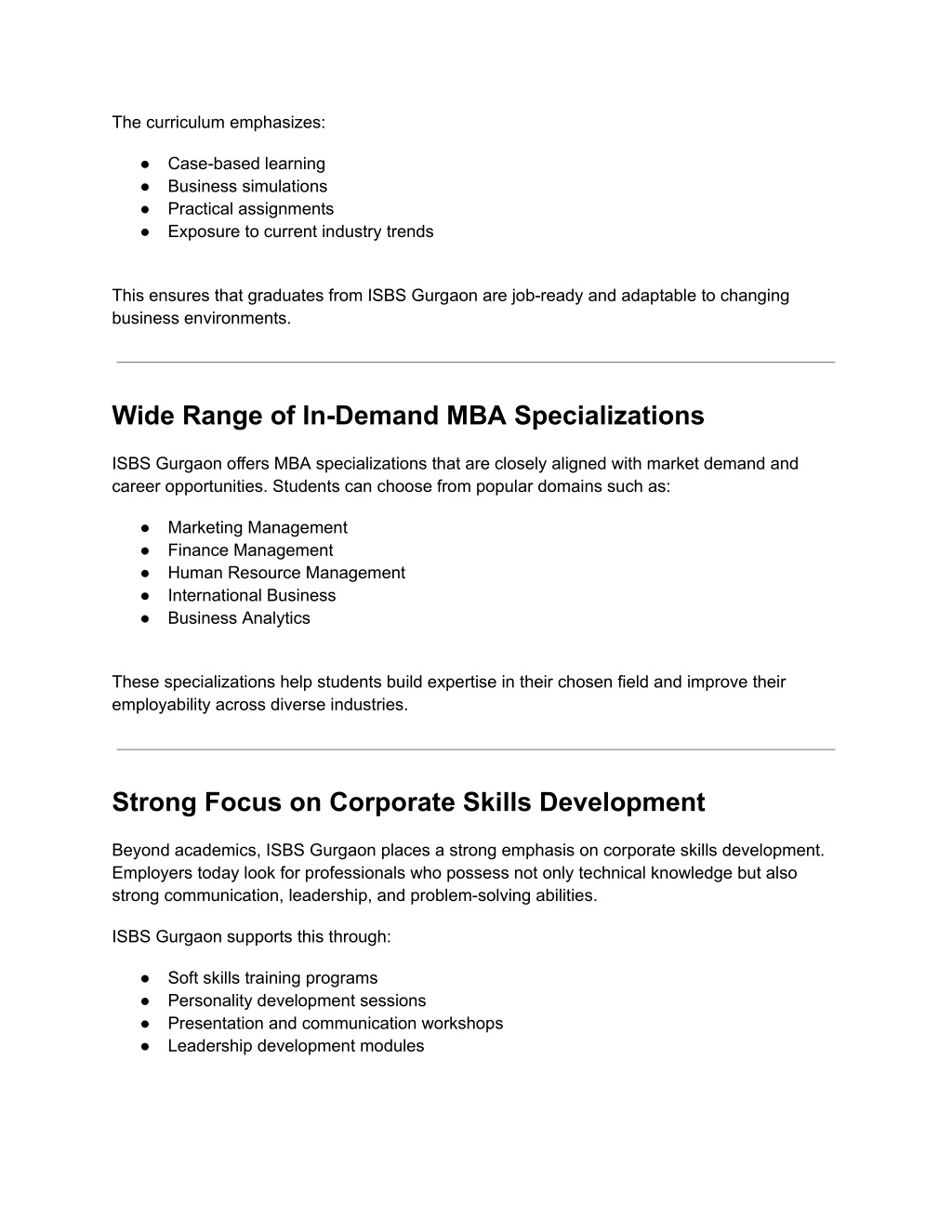 The curriculum emphasizes: ● Case-based learning ● Business simulations ● Practical assignments ● Exposure to current industry trends This ensures that graduates from ISBS Gurgaon are job-ready and adaptable to changing business environments. Wide Range of In-Demand MBA Specializations ISBS Gurgaon offers MBA specializations that are closely aligned with market demand and career opportunities. Students can choose from popular domains such as: ● Marketing Management ● Finance Management ● Human Resource Management ● International Business ● Business Analytics These specializations help students build expertise in their chosen field and improve their employability across diverse industries. Strong Focus on Corporate Skills Development Beyond academics, ISBS Gurgaon places a strong emphasis on corporate skills development. Employers today look for professionals who possess not only technical knowledge but also strong communication, leadership, and problem-solving abilities. ISBS Gurgaon supports this through: ● Soft skills training programs ● Personality development sessions ● Presentation and communication workshops ● Leadership development modules