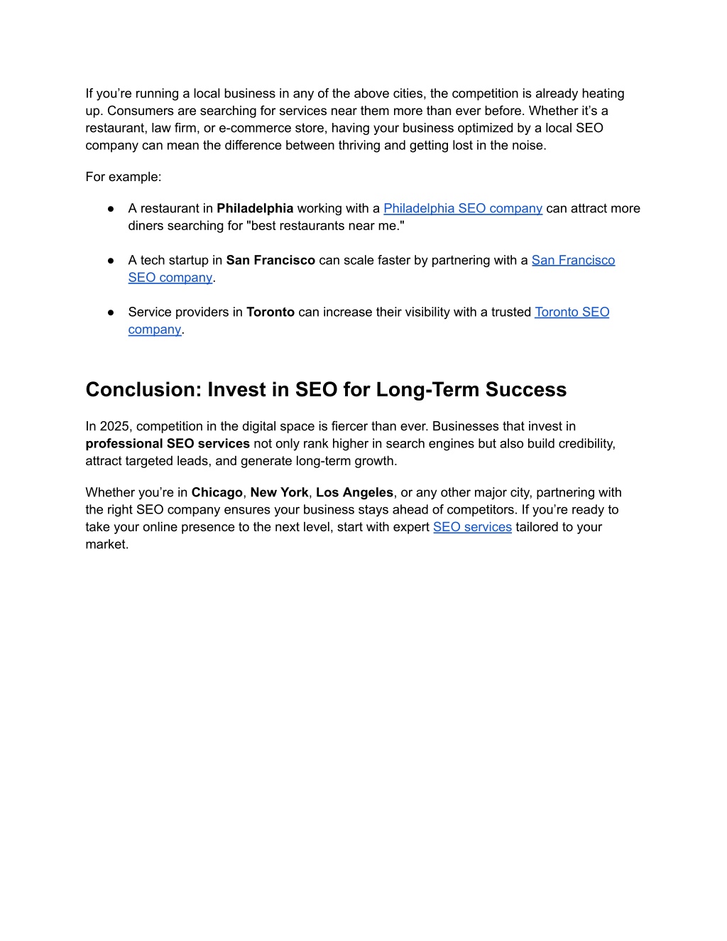If you’re running a local business in any of the above cities, the competition is already heating up. Consumers are searching for services near them more than ever before. Whether it’s a restaurant, law firm, or e-commerce store, having your business optimized by a local SEO company can mean the difference between thriving and getting lost in the noise. For example: ● A restaurant in Philadelphia working with a Philadelphia SEO company can attract more diners searching for "best restaurants near me." ● A tech startup in San Francisco can scale faster by partnering with a San Francisco SEO company. ● Service providers in Toronto can increase their visibility with a trusted Toronto SEO company. Conclusion: Invest in SEO for Long-Term Success In 2025, competition in the digital space is fiercer than ever. Businesses that invest in professional SEO services not only rank higher in search engines but also build credibility, attract targeted leads, and generate long-term growth. Whether you’re in Chicago, New York, Los Angeles, or any other major city, partnering with the right SEO company ensures your business stays ahead of competitors. If you’re ready to take your online presence to the next level, start with expert SEO services tailored to your market.