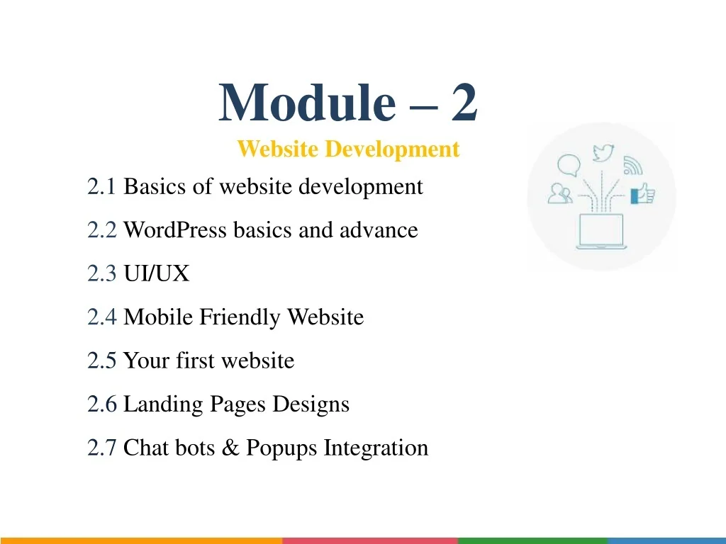Module – 2 Website Development 2.1 Basics of website development 2.2 WordPress basics and advance 2.3 UI/UX 2.4 Mobile Friendly Website 2.5 Your first website 2.6 Landing Pages Designs 2.7 Chat bots & Popups Integration