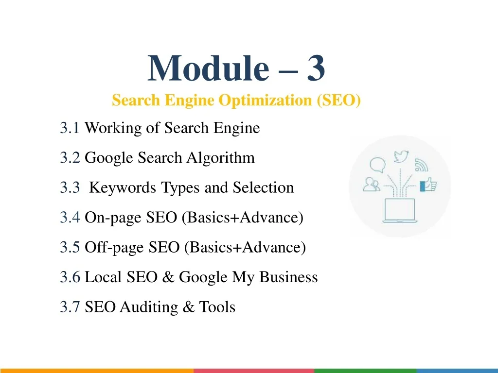 Module – 3 Search Engine Optimization (SEO) 3.1 Working of Search Engine 3.2 Google Search Algorithm 3.3 Keywords Types and Selection 3.4 On-page SEO (Basics+Advance) 3.5 Off-page SEO (Basics+Advance) 3.6 Local SEO & Google My Business 3.7 SEO Auditing & Tools
