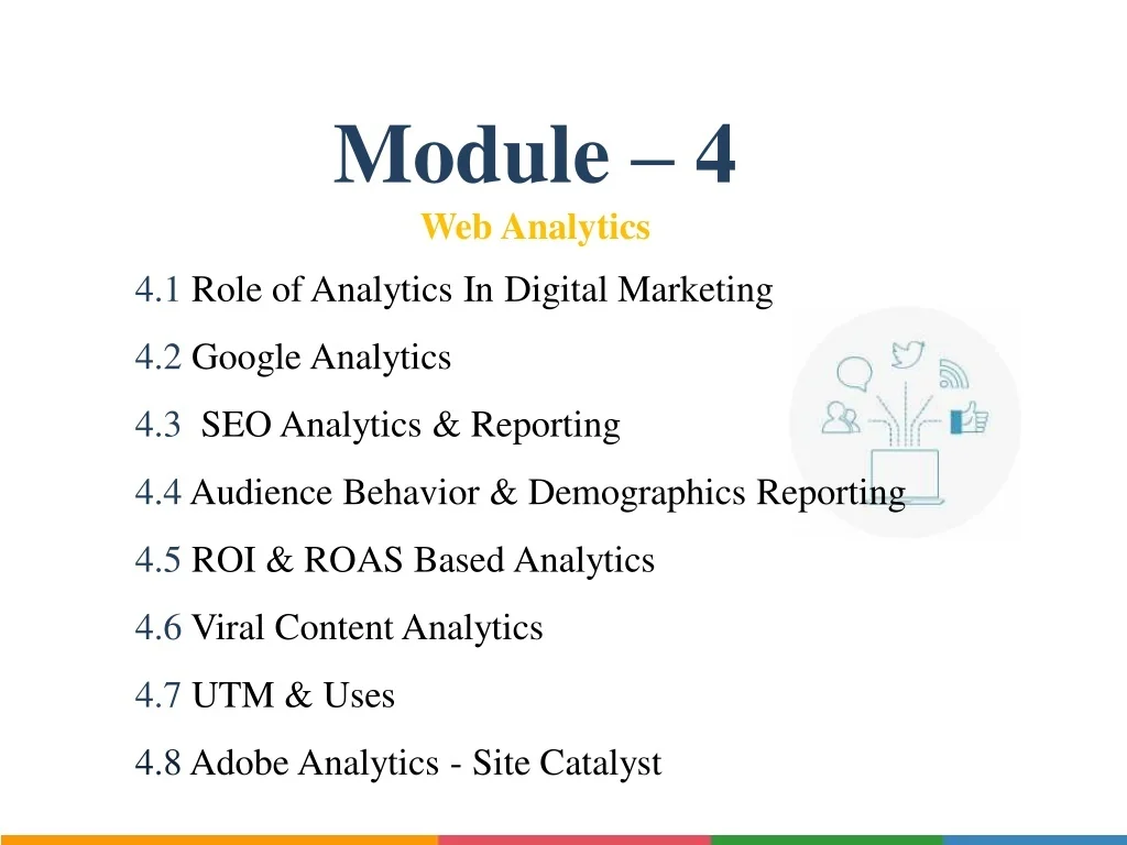 Module – 4 Web Analytics 4.1 Role of Analytics In Digital Marketing 4.2 Google Analytics 4.3 SEO Analytics & Reporting 4.4Audience Behavior & Demographics Reporting 4.5 ROI & ROAS Based Analytics 4.6 Viral Content Analytics 4.7 UTM & Uses 4.8Adobe Analytics - Site Catalyst