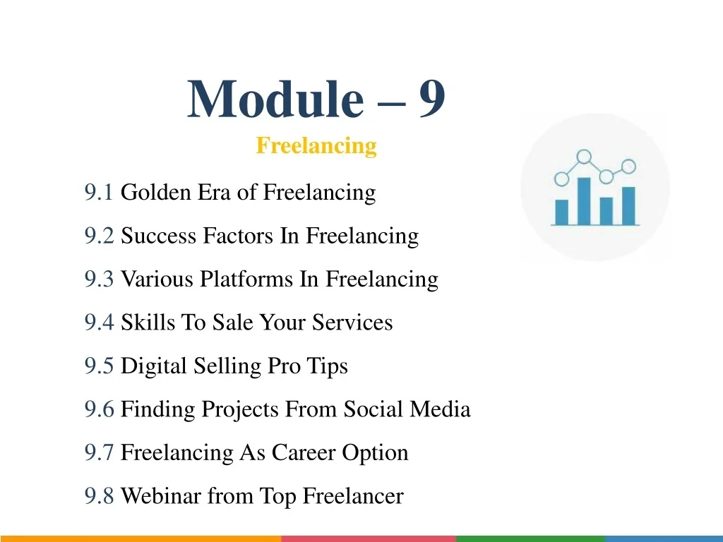 Module – 9 Freelancing 9.1 Golden Era of Freelancing 9.2 Success Factors In Freelancing 9.3 Various Platforms In Freelancing 9.4 Skills To Sale Your Services 9.5 Digital Selling Pro Tips 9.6 Finding Projects From Social Media 9.7 Freelancing As Career Option 9.8 Webinar from Top Freelancer