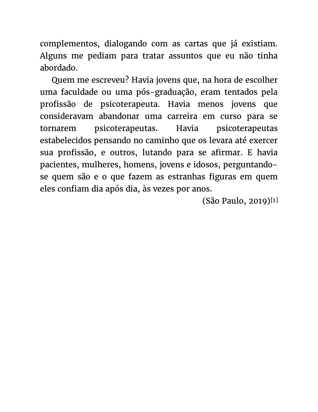 complementos, dialogando com as cartas que já existiam. Alguns me pediam para tratar assuntos que eu não tinha abordado. Quem me escreveu? Havia jovens que, na hora de escolher uma faculdade ou uma pós-graduação, eram tentados pela profissão de psicoterapeuta. Havia menos jovens que consideravam abandonar uma carreira em curso para se tornarem psicoterapeutas. estabelecidos pensando no caminho que os levara até exercer sua profissão, e outros, lutando para se afirmar. E havia pacientes, mulheres, homens, jovens e idosos, perguntando- se quem são e o que fazem as estranhas figuras em quem eles confiam dia após dia, às vezes por anos. Havia psicoterapeutas (São Paulo, 2019)[1]