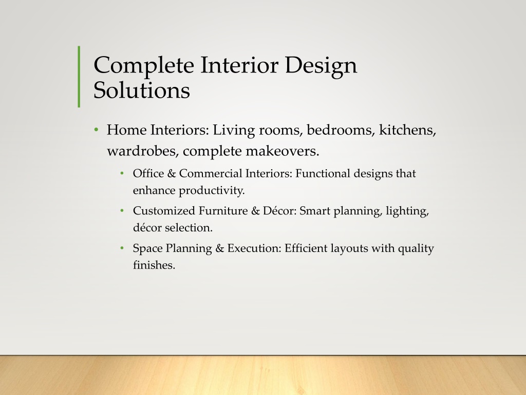 Complete Interior Design Solutions • Home Interiors: Living rooms, bedrooms, kitchens, wardrobes, complete makeovers. • Office & Commercial Interiors: Functional designs that enhance productivity. • Customized Furniture & Décor: Smart planning, lighting, décor selection. • Space Planning & Execution: Efficient layouts with quality finishes.