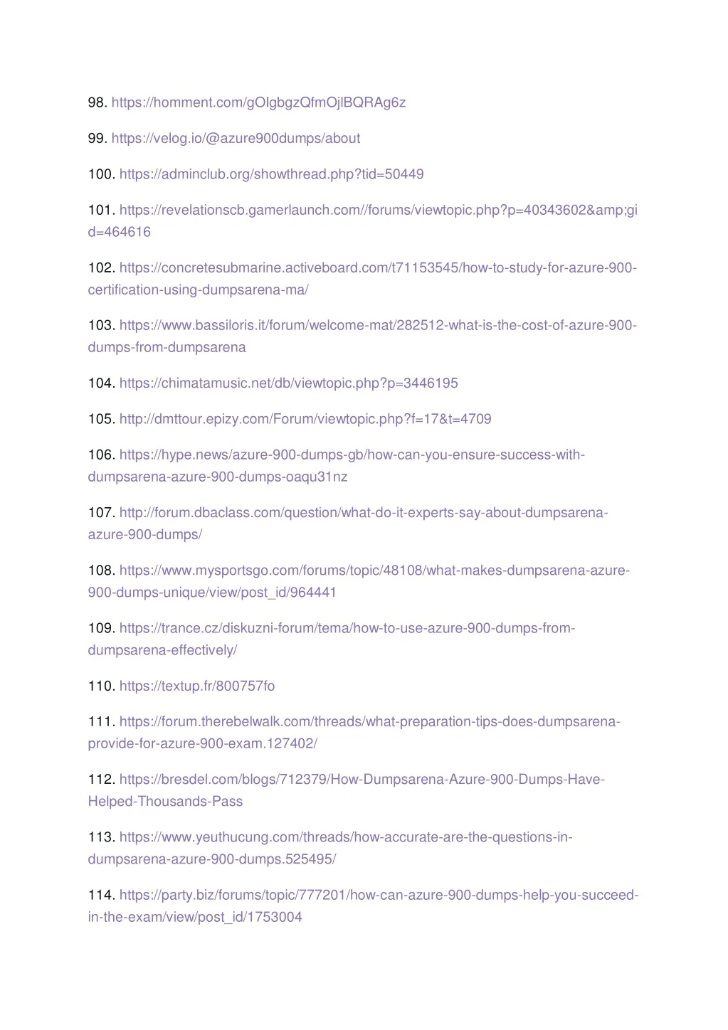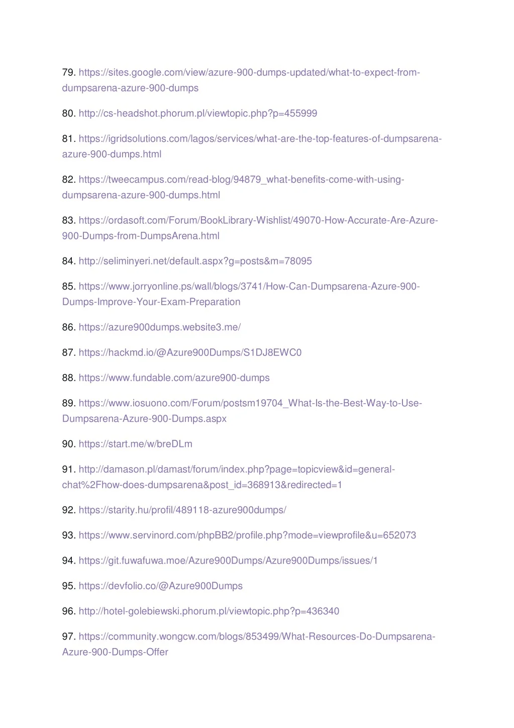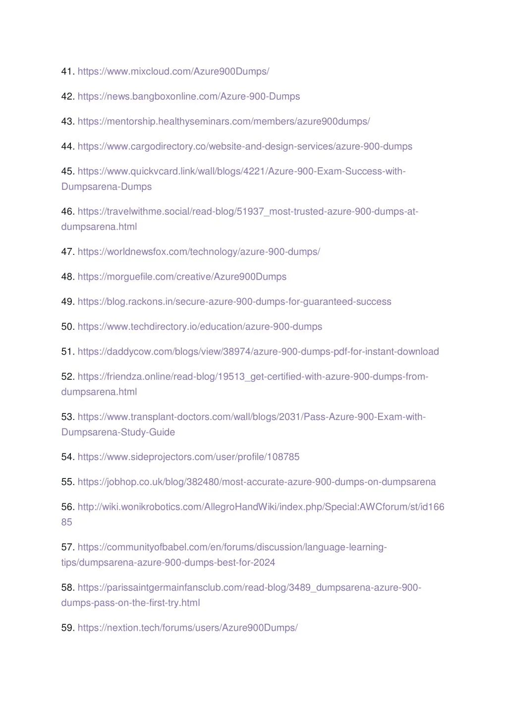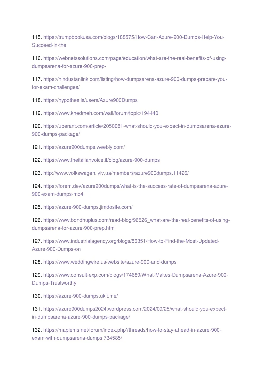 115. https://trumpbookusa.com/blogs/188575/How-Can-Azure-900-Dumps-Help-You- Succeed-in-the 116. https://webnetssolutions.com/page/education/what-are-the-real-benefits-of-using- dumpsarena-for-azure-900-prep- 117. https://hindustanlink.com/listing/how-dumpsarena-azure-900-dumps-prepare-you- for-exam-challenges/ 118. https://hypothes.is/users/Azure900Dumps 119. https://www.khedmeh.com/wall/forum/topic/194440 120. https://uberant.com/article/2050081-what-should-you-expect-in-dumpsarena-azure- 900-dumps-package/ 121. https://azure900dumps.weebly.com/ 122. https://www.theitalianvoice.it/blog/azure-900-dumps 123. http://www.volkswagen.lviv.ua/members/azure900dumps.11426/ 124. https://forem.dev/azure900dumps/what-is-the-success-rate-of-dumpsarena-azure- 900-exam-dumps-md4 125. https://azure-900-dumps.jimdosite.com/ 126. https://www.bondhuplus.com/read-blog/96526_what-are-the-real-benefits-of-using- dumpsarena-for-azure-900-prep.html 127. https://www.industrialagency.org/blogs/86351/How-to-Find-the-Most-Updated- Azure-900-Dumps-on 128. https://www.weddingwire.us/website/azure-900-and-dumps 129. https://www.consult-exp.com/blogs/174689/What-Makes-Dumpsarena-Azure-900- Dumps-Trustworthy 130. https://azure-900-dumps.ukit.me/ 131. https://azure900dumps2024.wordpress.com/2024/09/25/what-should-you-expect- in-dumpsarena-azure-900-dumps-package/ 132. https://maplems.net/forum/index.php?threads/how-to-stay-ahead-in-azure-900- exam-with-dumpsarena-dumps.734585/