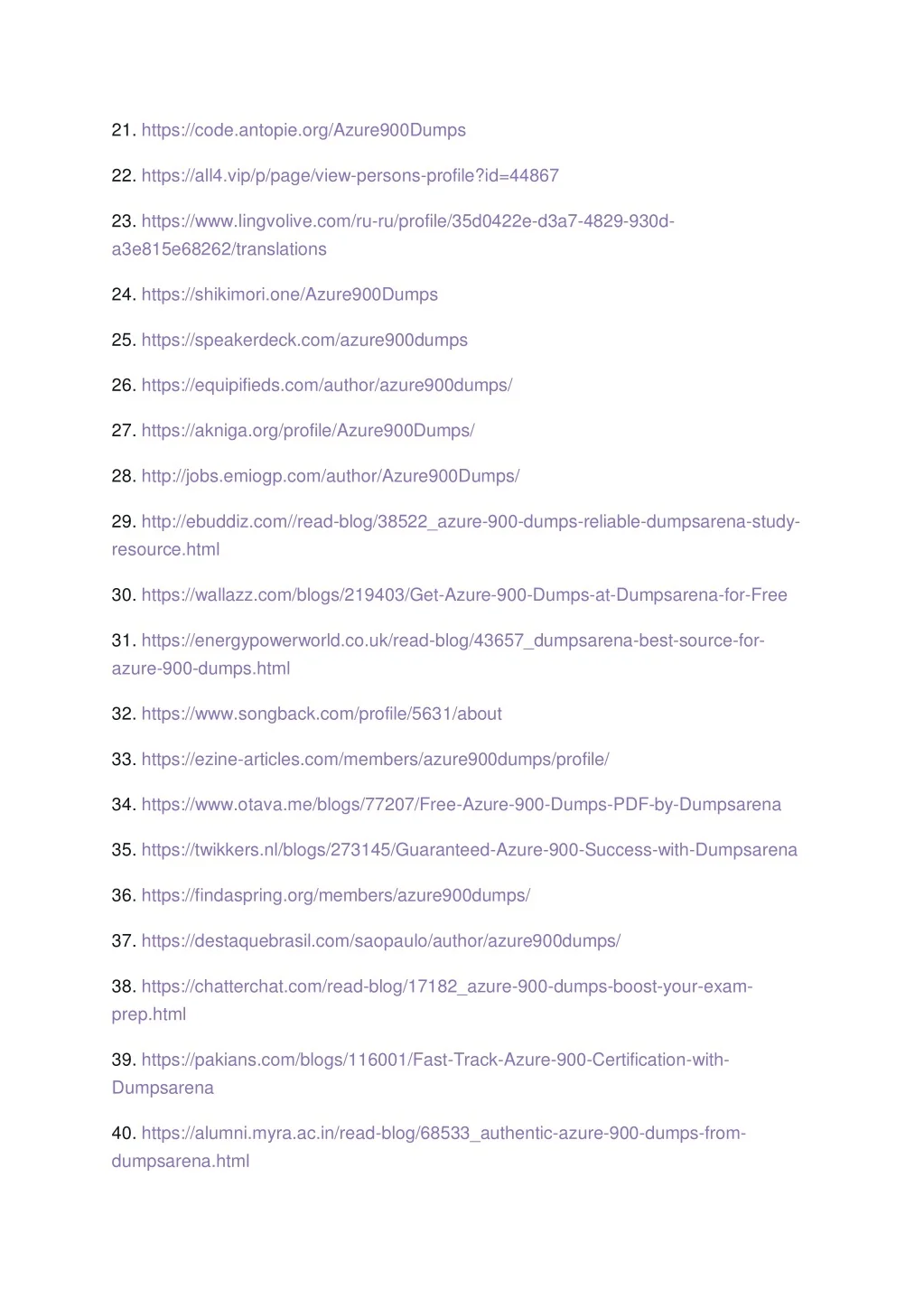 21. https://code.antopie.org/Azure900Dumps 22. https://all4.vip/p/page/view-persons-profile?id=44867 23. https://www.lingvolive.com/ru-ru/profile/35d0422e-d3a7-4829-930d- a3e815e68262/translations 24. https://shikimori.one/Azure900Dumps 25. https://speakerdeck.com/azure900dumps 26. https://equipifieds.com/author/azure900dumps/ 27. https://akniga.org/profile/Azure900Dumps/ 28. http://jobs.emiogp.com/author/Azure900Dumps/ 29. http://ebuddiz.com//read-blog/38522_azure-900-dumps-reliable-dumpsarena-study- resource.html 30. https://wallazz.com/blogs/219403/Get-Azure-900-Dumps-at-Dumpsarena-for-Free 31. https://energypowerworld.co.uk/read-blog/43657_dumpsarena-best-source-for- azure-900-dumps.html 32. https://www.songback.com/profile/5631/about 33. https://ezine-articles.com/members/azure900dumps/profile/ 34. https://www.otava.me/blogs/77207/Free-Azure-900-Dumps-PDF-by-Dumpsarena 35. https://twikkers.nl/blogs/273145/Guaranteed-Azure-900-Success-with-Dumpsarena 36. https://findaspring.org/members/azure900dumps/ 37. https://destaquebrasil.com/saopaulo/author/azure900dumps/ 38. https://chatterchat.com/read-blog/17182_azure-900-dumps-boost-your-exam- prep.html 39. https://pakians.com/blogs/116001/Fast-Track-Azure-900-Certification-with- Dumpsarena 40. https://alumni.myra.ac.in/read-blog/68533_authentic-azure-900-dumps-from- dumpsarena.html