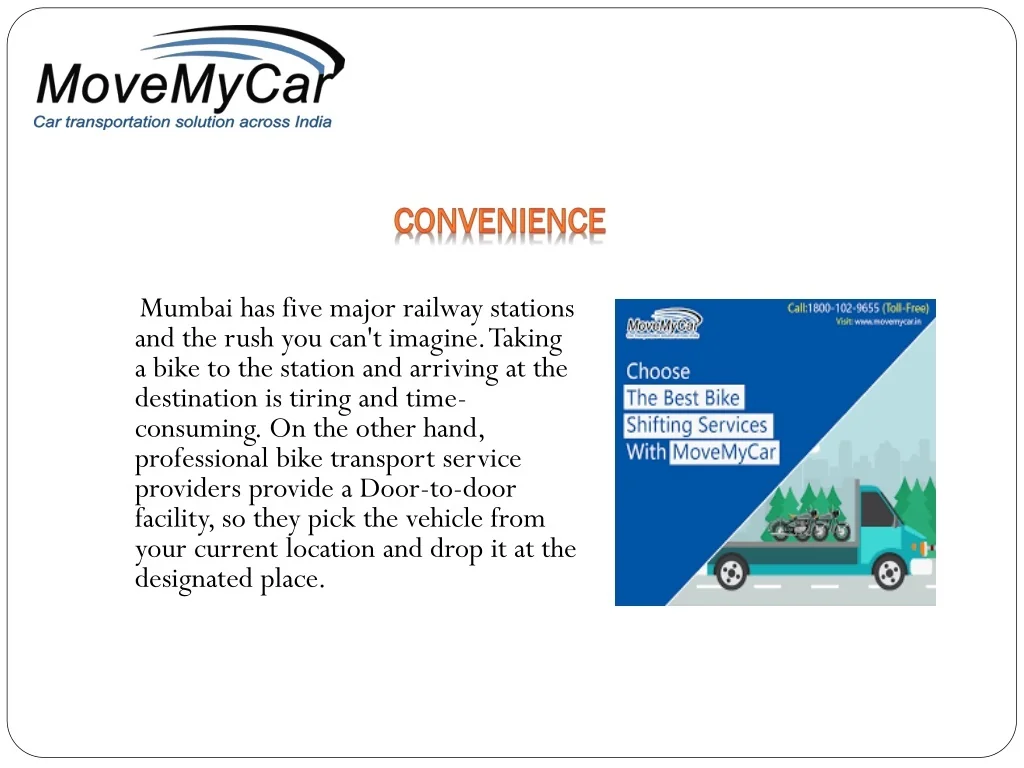 Convenience Mumbai has five major railway stations and the rush you can't imagine. Taking a bike to the station and arriving at the destination is tiring and time-consuming. On the other hand, professional bike transport service providers provide a Door-to-door facility, so they pick the vehicle from your current location and drop it at the designated place.