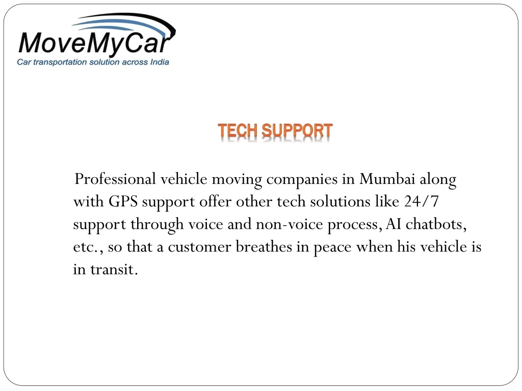 Tech support Professional vehicle moving companies in Mumbai along with GPS support offer other tech solutions like 24/7 support through voice and non-voice process, AI chatbots, etc., so that a customer breathes in peace when his vehicle is in transit.