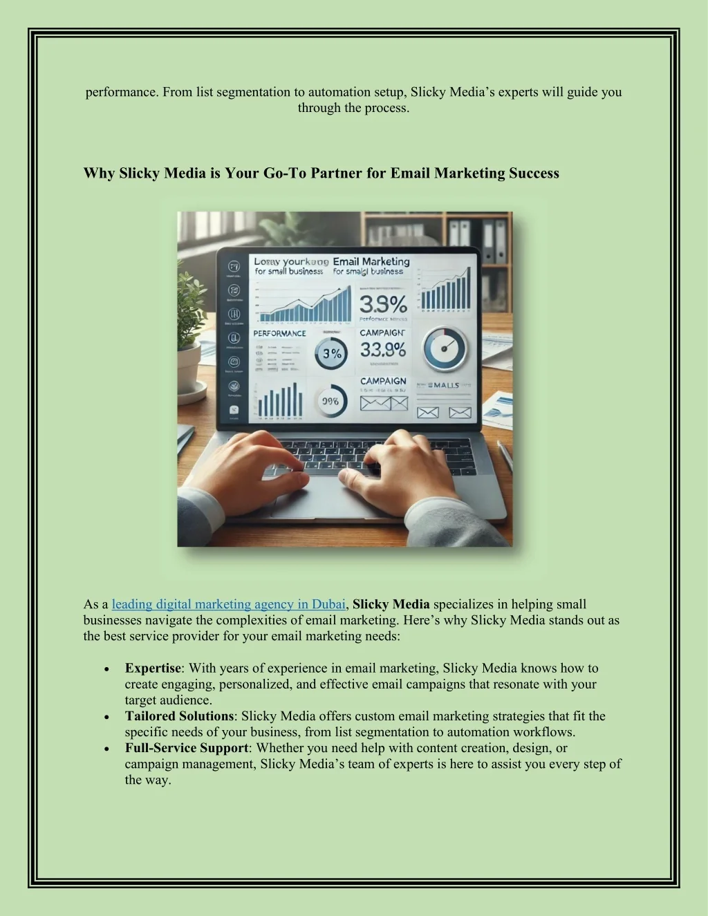performance. From list segmentation to automation setup, Slicky Media’s experts will guide you through the process. Why Slicky Media is Your Go-To Partner for Email Marketing Success As a leading digital marketing agency in Dubai, Slicky Media specializes in helping small businesses navigate the complexities of email marketing. Here’s why Slicky Media stands out as the best service provider for your email marketing needs: Expertise: With years of experience in email marketing, Slicky Media knows how to create engaging, personalized, and effective email campaigns that resonate with your target audience. Tailored Solutions: Slicky Media offers custom email marketing strategies that fit the specific needs of your business, from list segmentation to automation workflows. Full-Service Support: Whether you need help with content creation, design, or campaign management, Slicky Media’s team of experts is here to assist you every step of the way.
