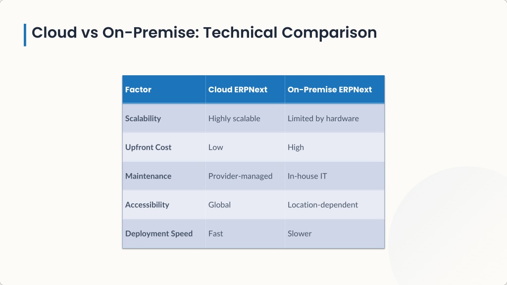 Compare ERPNext deployment modelsu2014cloud vs on-premiseu2014to evaluate scalability, security, costs, and performance. Choose the right ERP infrastructure for your business growth.