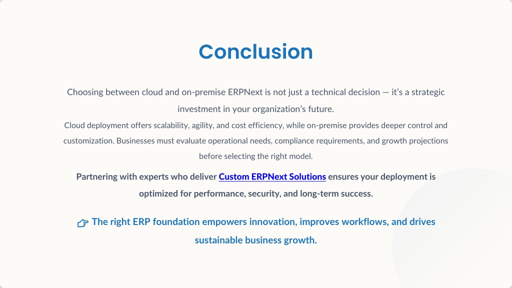 How to Choose the Right Deployment Model Choose Cloud If: Choose On-Premise If: You expect rapid growth Data sovereignty is critical Remote access is essential You need extreme customization You want minimal IT management Internal IT resources are strong Agility is a priority 👉 The best decision aligns technology with long-term business strategy.