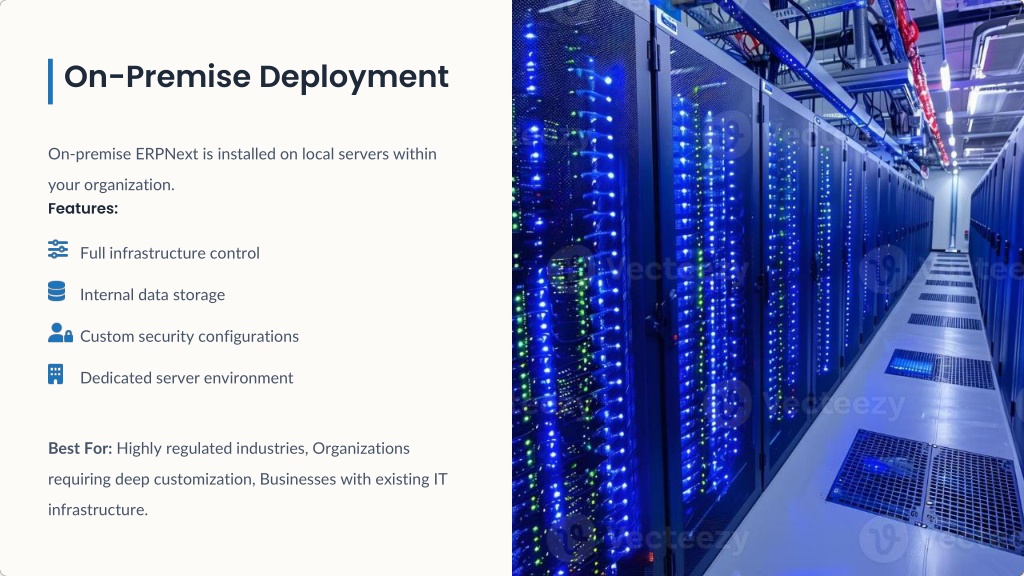 On-Premise Deployment On-premise ERPNext is installed on local servers within your organization. Features: Full infrastructure control Internal data storage Custom security configurations Dedicated server environment Best For: Highly regulated industries, Organizations requiring deep customization, Businesses with existing IT infrastructure.