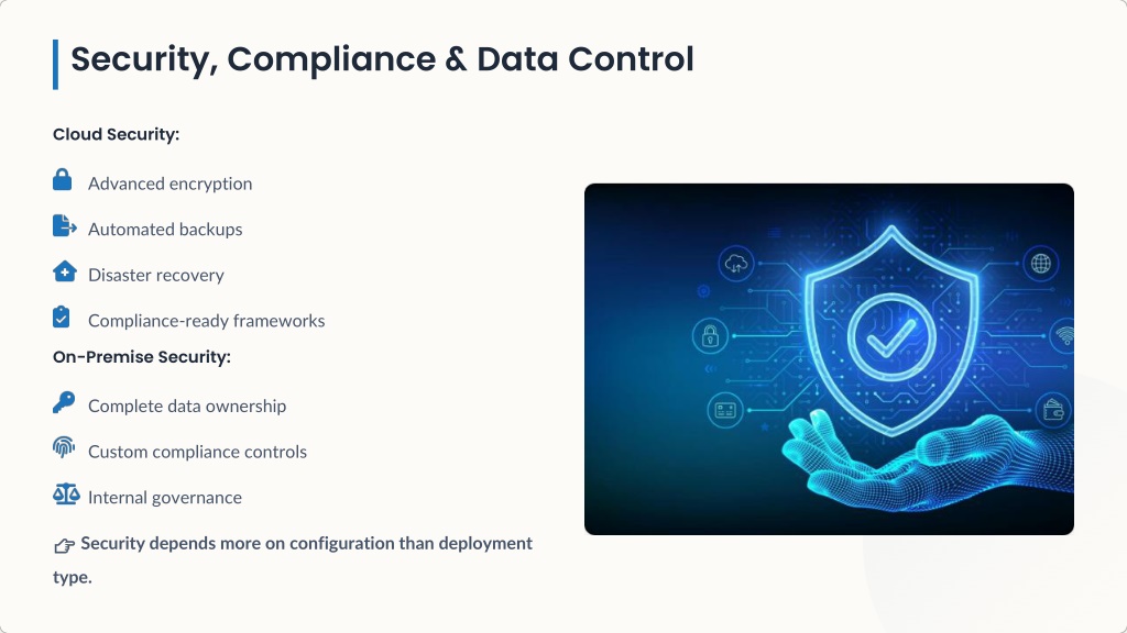 Security, Compliance & Data Control Cloud Security: Advanced encryption Automated backups Disaster recovery Compliance-ready frameworks On-Premise Security: Complete data ownership Custom compliance controls Internal governance 👉 Security depends more on configuration than deployment type.