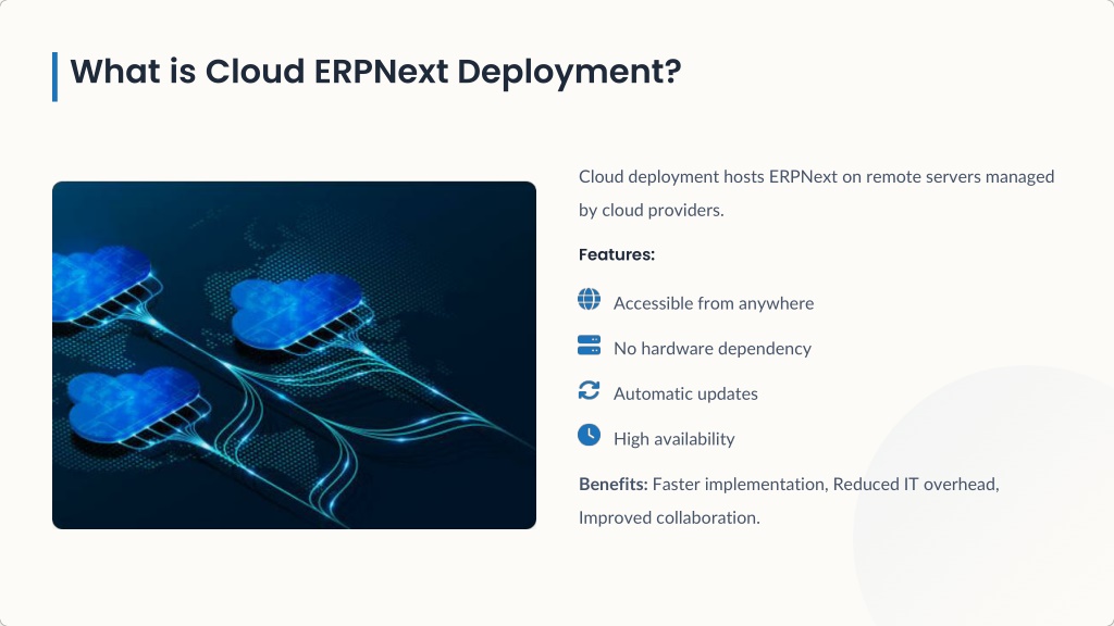 What is Cloud ERPNext Deployment? Cloud deployment hosts ERPNext on remote servers managed by cloud providers. Features: Accessible from anywhere No hardware dependency Automatic updates High availability Benefits: Faster implementation, Reduced IT overhead, Improved collaboration.
