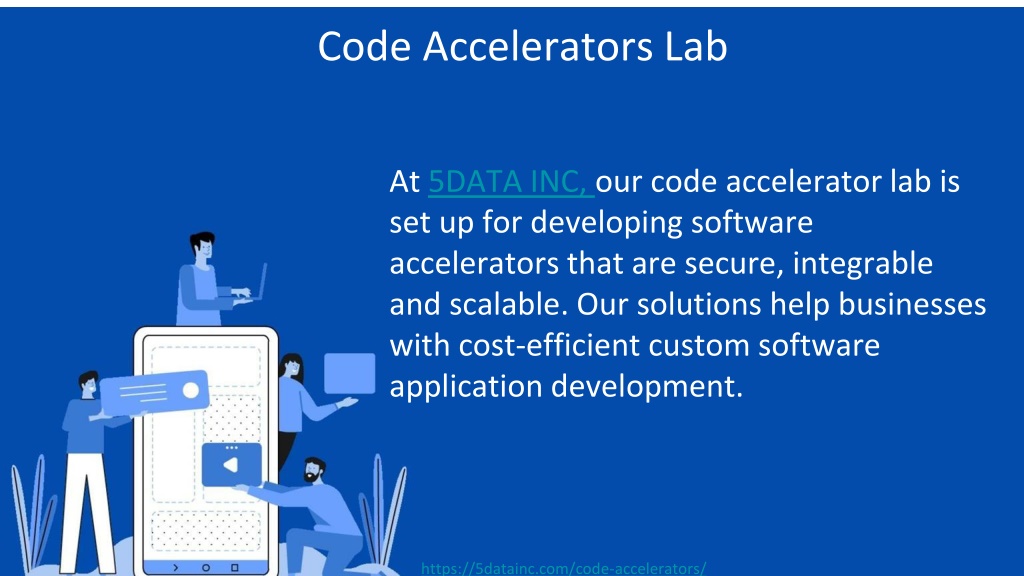 Code Accelerators Lab At 5DATA INC, our code accelerator lab is set up for developing software accelerators that are secure, integrable and scalable. Our solutions help businesses with cost-efficient custom software application development. https://5datainc.com/code-accelerators/