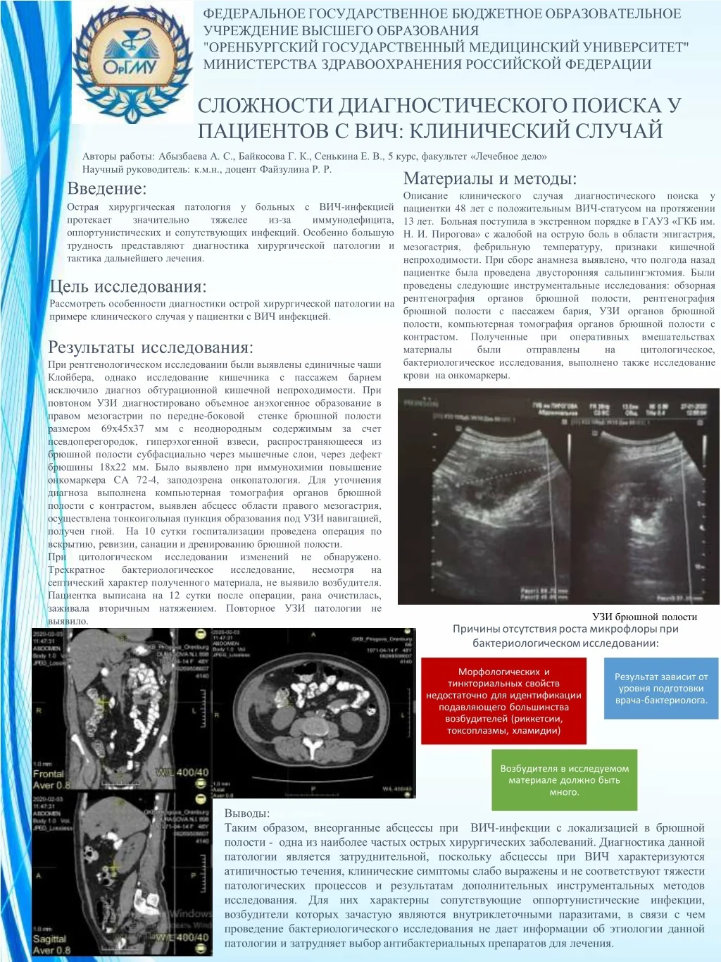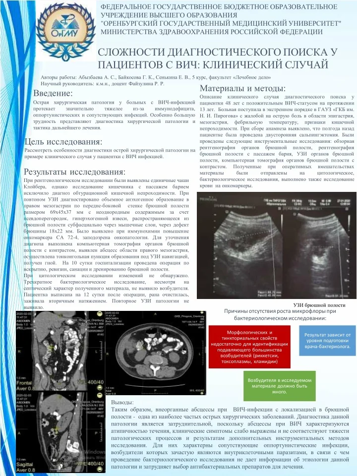 ФЕДЕРАЛЬНОЕ ГОСУДАРСТВЕННОЕ БЮДЖЕТНОЕ ОБРАЗОВАТЕЛЬНОЕ УЧРЕЖДЕНИЕ ВЫСШЕГО ОБРАЗОВАНИЯ "ОРЕНБУРГСКИЙ ГОСУДАРСТВЕННЫЙ МЕДИЦИНСКИЙ УНИВЕРСИТЕТ" МИНИСТЕРСТВА ЗДРАВООХРАНЕНИЯ РОССИЙСКОЙ ФЕДЕРАЦИИ СЛОЖНОСТИ ДИАГНОСТИЧЕСКОГО ПОИСКА У ПАЦИЕНТОВ С ВИЧ: КЛИНИЧЕСКИЙ СЛУЧАЙ Авторы работы: Абызбаева А. С., Байкосова Г. К., Сенькина Е. В., 5 курс, факультет «Лечебное дело» Научный руководитель: к.м.н., доцент Файзулина Р. Р. Введение: Острая хирургическая патология у больных с протекает значительно тяжелее из-за оппортунистических и сопутствующих инфекций. Особенно большую трудность представляют диагностика хирургической патологии и тактика дальнейшего лечения. Материалы и методы: Описание клинического пациентки 48 лет с положительным ВИЧ-статусом на протяжении 13 лет. Больная поступила в экстренном порядке в ГАУЗ «ГКБ им. Н. И. Пирогова» с жалобой на острую боль в области эпигастрия, мезогастрия, фебрильную температуру, непроходимости. При сборе анамнеза выявлено, что полгода назад пациентке была проведена двусторонняя сальпингэктомия. Были проведены следующие инструментальные исследования: обзорная рентгенография органов брюшной брюшной полости с пассажем бария, УЗИ органов брюшной полости, компьютерная томография органов брюшной полости с контрастом. Полученные при материалы были отправлены бактериологическое исследования, выполнено также исследование крови на онкомаркеры. случая диагностического поиска у ВИЧ-инфекцией иммунодефицита, признаки кишечной Цель исследования: Рассмотреть особенности диагностики острой хирургической патологии на примере клинического случая у пациентки с ВИЧ инфекцией. полости, рентгенография оперативных вмешательствах цитологическое, Результаты исследования: При рентгенологическом исследовании были выявлены единичные чаши Клойбера, однако исследование исключило диагноз обтурационной кишечной непроходимости. При повтоном УЗИ диагностировано объемное анэхогенное образование в правом мезогастрии по передне-боковой размером 69х45х37 мм с неоднородным псевдоперегородок, гиперэхогенной взвеси, распространяющееся из брюшной полости субфасциально через мышечные слои, через дефект брюшины 18х22 мм. Было выявлено при иммунохимии повышение онкомаркера CA 72-4, заподозрена онкопатология. Для уточнения диагноза выполнена компьютерная томография органов брюшной полости с контрастом, выявлен абсцесс области правого мезогастрия, осуществлена тонкоигольная пункция образования под УЗИ навигацией, получен гной. На 10 сутки госпитализации проведена операция по вскрытию, ревизии, санации и дренированию брюшной полости. При цитологическом исследовании Трехкратное бактериологическое септический характер полученного материала, не выявило возбудителя. Пациентка выписана на 12 сутки после операции, рана очистилась, заживала вторичным натяжением. выявило. на кишечника с пассажем барием стенке брюшной полости содержимым за счет обнаружено. несмотря изменений исследование, не на Повторное УЗИ патологии не УЗИ брюшной полости Причины отсутствия роста микрофлоры при бактериологическом исследовании: Морфологических и тинкториальных свойств недостаточно для идентификации подавляющего большинства возбудителей (риккетсии, токсоплазмы, хламидии) Результат зависит от уровня подготовки врача-бактер