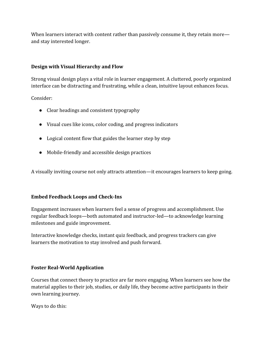 When learners interact with content rather than passively consume it, they retain more— and stay interested longer. Design with Visual Hierarchy and Flow Strong visual design plays a vital role in learner engagement. A cluttered, poorly organized interface can be distracting and frustrating, while a clean, intuitive layout enhances focus. Consider: ●Clear headings and consistent typography ●Visual cues like icons, color coding, and progress indicators ●Logical content flow that guides the learner step by step ●Mobile-friendly and accessible design practices A visually inviting course not only attracts attention—it encourages learners to keep going. Embed Feedback Loops and Check-Ins Engagement increases when learners feel a sense of progress and accomplishment. Use regular feedback loops—both automated and instructor-led—to acknowledge learning milestones and guide improvement. Interactive knowledge checks, instant quiz feedback, and progress trackers can give learners the motivation to stay involved and push forward. Foster Real-World Application Courses that connect theory to practice are far more engaging. When learners see how the material applies to their job, studies, or daily life, they become active participants in their own learning journey. Ways to do this: