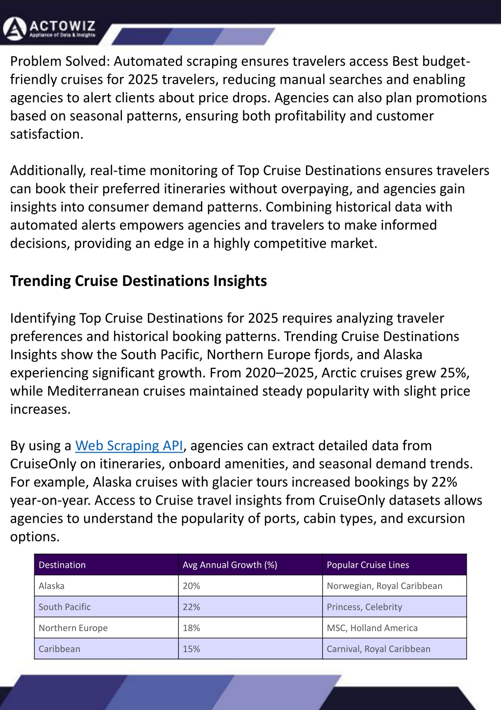 Whether you’re focused on optimizing promotions, managing inventories, or offering clients Affordable Cruise Deals 2025, Actowiz provides the data-driven foundation to achieve measurable outcomes. By leveraging our tools, businesses can respond quickly to Cruise Travel Trends 2025, maximize operational efficiency, and increase return on investment. With Actowiz, agencies can future-proof their cruise travel strategies, ensuring clients always receive the best value, experience, and travel opportunities. Conclusion As 2025 approaches, travelers are seeking unique adventures across Top Cruise Destinations worldwide, from Caribbean escapes to Mediterranean journeys. At the same time, cruise businesses must adapt to changing consumer expectations, competitive pricing, and shifting inventory trends. Data-driven strategies are no longer optional—they are essential for success. With Actowiz Solutions, agencies can scrape Cruise Deals Dataset, monitor Real-Time Cruise Pricing Data, and harness CruiseOnly Data Scraping Services to transform raw information into valuable insights. This enables accurate forecasting, proactive pricing, and personalized booking recommendations, ensuring every client finds the perfect voyage at the best possible rate. By leveraging Cruise travel insights from CruiseOnly datasets, agencies can anticipate Cruise Travel Trends 2025 and confidently provide Affordable Cruise Deals 2025 that resonate with travelers. Whether optimizing cabin availability, enhancing promotional campaigns, or identifying Trending Cruise Destinations Insights, Actowiz empowers businesses to lead with intelligence and innovation. Now is the time to embrace smarter travel planning. Partner with Actowiz Solutions today to unlock cruise intelligence, boost engagement, and secure unbeatable deals for your clients. Take advantage of real-time data and maximize opportunities across the global cruise market in 2025! You can also reach us for all your mobile app scraping, data collection, web scraping , and instant data scraper service requirements! Extracting Information from TripAdvisor: A Guide to Scraping Data from Hotels and Restaurants How to Effectively Use Competitor Price Trackers: Operational Guidance and Benefits How to Use Zomato API to Scrape Restaurant Data – A Detailed Guide What are Datasets? - A Comprehensive Guide Introduction Introduction This blog will provide a comprehensive overview of datasets, including their definition, different types of datasets, and strategies for maximizing the value of data. Leveraging the appropriate API makes scraping TripAdvisor on a large scale a straightforward task. You don't need to possess advanced computer skills to achieve this. Our comprehensive, step-by-step guide is designed to walk you through extracting data from TripAdvisor using a user-friendly web scraping tool. In the dynamic landscape of eCommerce, pricing strategy stands paramount, especially for digital storefronts. Modern consumers are discerning, often prioritizing price comparison as a pivotal step before purchasing. The allure of securing the best deals and most competitive prices drives this behavior. Consequently, a significant portion of online shoppers actively engage in price monitoring across various platforms. Recognizing this trend, online retailers must adeptly employ competitor price trackers to stay ahead. What is a Dataset? Introduction In the dynamic world of digital gastronomy, where culinary delights and dining experiences are increasingly explored and celebrated online, the demand for up-to-date restaurant data is insatiable. As food enthusiasts and businesses seek the latest insights into menus, reviews, and more, the Zomato API emerges as a powerful tool for scraping this invaluable information. TripAdvisor stands out as a powerhouse with an extensive database comprising over 8 million locations, 1 billion reviews, and support for 29 languages. As of 2022, when the cumulative reviews surpassed the one billion mark, it became evident that TripAdvisor's meticulous gaze would soon cover every restaurant, hotel, vacation rental, or attraction listing. By leveraging retail data scraping techniques, businesses can collect comprehensive retail data, offering insights into the broader market's pricing landscape. Such price intelligence empowers retailers to craft a robust pricing strategy, bolstering sales, enhancing profit margins, and fostering customer loyalty. Moreover, a data-driven eCommerce pricing approach ensures competitiveness, with dynamic pricing becoming increasingly prevalent. Unlocking the Potential: The Advantages of Scraping TripAdvisor Data Our comprehensive guide delves into the intricate art of utilizing the Zomato API to scrape restaurant data. Whether you're a restaurateur striving to understand your competitors, a food blogger searching for fresh content, or a data enthusiast eager to explore culinary trends, this guide will serve as your compass in the world of data extraction. In essence, utilizing a competent competitor price tracker facilitates effective pricing optimization and solidifies a retailer's position in the fiercely competitive eCommerce arena. Amidst TripAdvisor's vast sea of information lies a treasure trove awaiting extraction, analysis, and innovative presentation. For those in the tourism, hospitality, or travel sectors, harnessing TripAdvisor data proves invaluable for monitoring competitors and supporting strategic business decisions. The TripAdvisor Scraper facilitates seamless and rapid web scraping, offering the most straightforward route to consistently obtaining data at scale. This article delves into the myriad benefits of scraping TripAdvisor, shedding light on how this process can be initiated, including exploring the initial steps involving API utilization. Dive into the realm of data-driven insights with TripAdvisor scraping. We will navigate through the intricacies of Zomato Scraper, uncovering its capabilitie