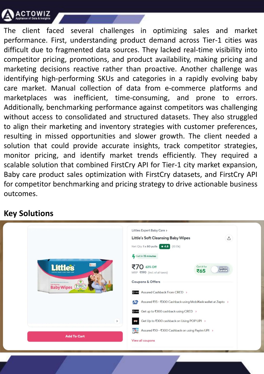 Discover how Baby Care Brand leveraged sales data using FirstCry API to optimize strategies, boost sales by 25% in Tier-1 cities, and enhance growth. By analyzing comprehensive datasets from FirstCry, the client was able to identify high-demand products, monitor competitor pricing, and understand consumer preferences. The approach combined advanced FirstCry API Sales Boost techniques, market insights, and e-commerce analytics to provide actionable strategies.