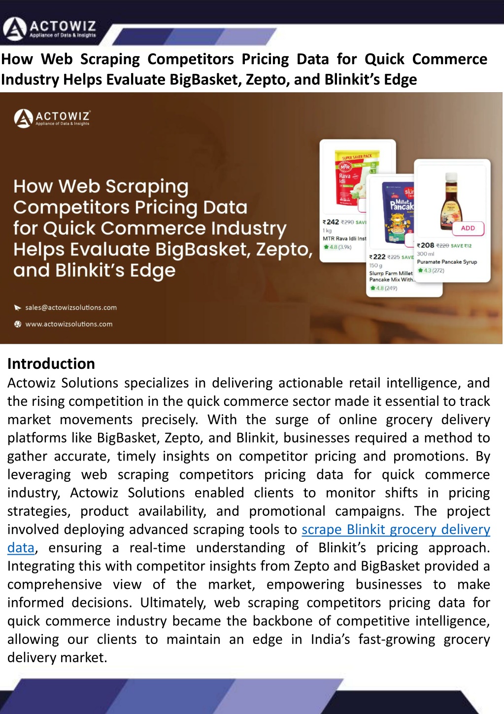 Discover how web scraping competitors pricing data for quick commerce industry provides insights into BigBasket, Zepto, and Blinkitu2019s pricing edge. The project involved deploying advanced scraping tools tou00a0scrape Blinkit grocery delivery data, ensuring a real-time understanding of Blinkitu2019s pricing approach. Integrating this with competitor insights from Zepto and BigBasket provided a comprehensive view of the market, empowering businesses to make informed decisions.