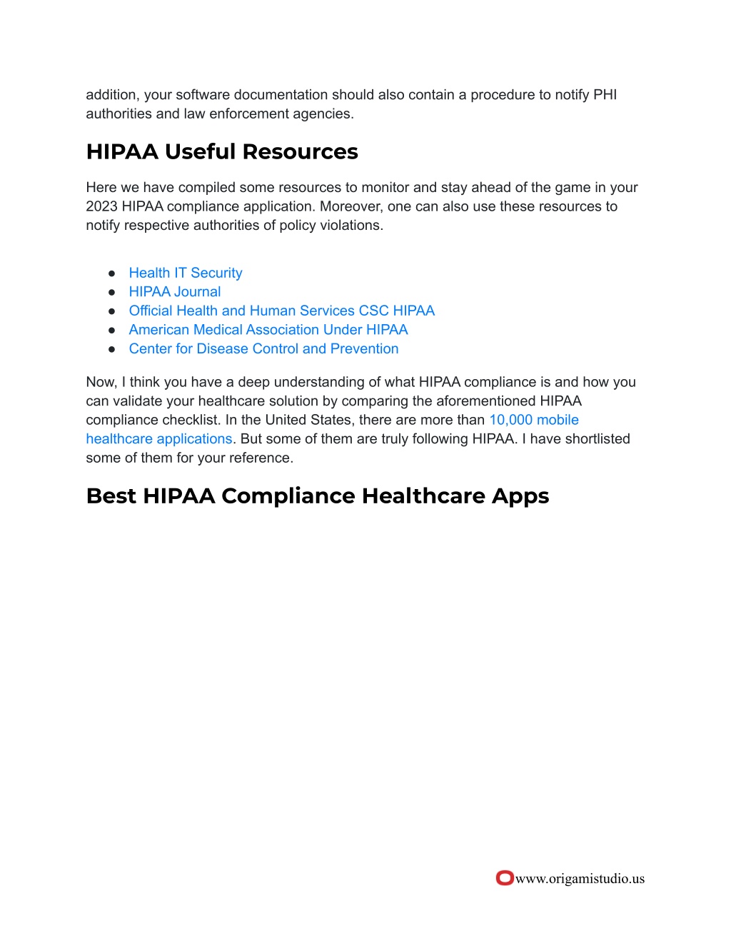 addition, your software documentation should also contain a procedure to notify PHI authorities and law enforcement agencies. HIPAA Useful Resources Here we have compiled some resources to monitor and stay ahead of the game in your 2023 HIPAA compliance application. Moreover, one can also use these resources to notify respective authorities of policy violations. ● Health IT Security ● HIPAA Journal ● Official Health and Human Services CSC HIPAA ● American Medical Association Under HIPAA ● Center for Disease Control and Prevention Now, I think you have a deep understanding of what HIPAA compliance is and how you can validate your healthcare solution by comparing the aforementioned HIPAA compliance checklist. In the United States, there are more than 10,000 mobile healthcare applications. But some of them are truly following HIPAA. I have shortlisted some of them for your reference. Best HIPAA Compliance Healthcare Apps www.origamistudio.us