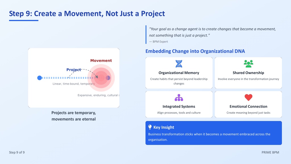 Step 9: Create a Movement, Not Just a Project "Your goal as a change agent is to create changes that become a movement, not something that is just a project." — BPM Expert Embedding Change into Organizational DNA Organizational Memory Shared Ownership Create habits that persist beyond leadership changes Involve everyone in the transformation journey Integrated Systems Emotional Connection Projects are temporary, movements are eternal Align processes, tools and culture Create meaning beyond just tasks Key Insight Business transformation sticks when it becomes a movement embraced across the organisation. Step 9 of 9 PRIME BPM
