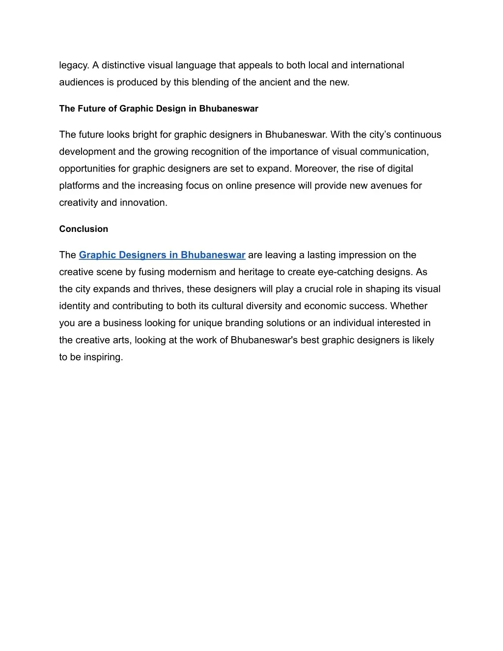 legacy. A distinctive visual language that appeals to both local and international audiences is produced by this blending of the ancient and the new. The Future of Graphic Design in Bhubaneswar The future looks bright for graphic designers in Bhubaneswar. With the city’s continuous development and the growing recognition of the importance of visual communication, opportunities for graphic designers are set to expand. Moreover, the rise of digital platforms and the increasing focus on online presence will provide new avenues for creativity and innovation. Conclusion The Graphic Designers in Bhubaneswar are leaving a lasting impression on the creative scene by fusing modernism and heritage to create eye-catching designs. As the city expands and thrives, these designers will play a crucial role in shaping its visual identity and contributing to both its cultural diversity and economic success. Whether you are a business looking for unique branding solutions or an individual interested in the creative arts, looking at the work of Bhubaneswar's best graphic designers is likely to be inspiring.