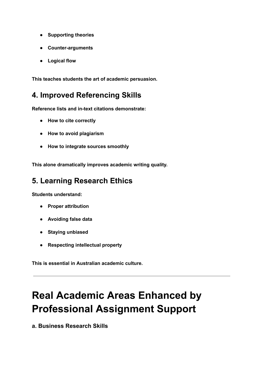 ● Supporting theories ● Counter-arguments ● Logical flow This teaches students the art of academic persuasion. 4. Improved Referencing Skills Reference lists and in-text citations demonstrate: ● How to cite correctly ● How to avoid plagiarism ● How to integrate sources smoothly This alone dramatically improves academic writing quality. 5. Learning Research Ethics Students understand: ● Proper attribution ● Avoiding false data ● Staying unbiased ● Respecting intellectual property This is essential in Australian academic culture. Real Academic Areas Enhanced by Professional Assignment Support a. Business Research Skills