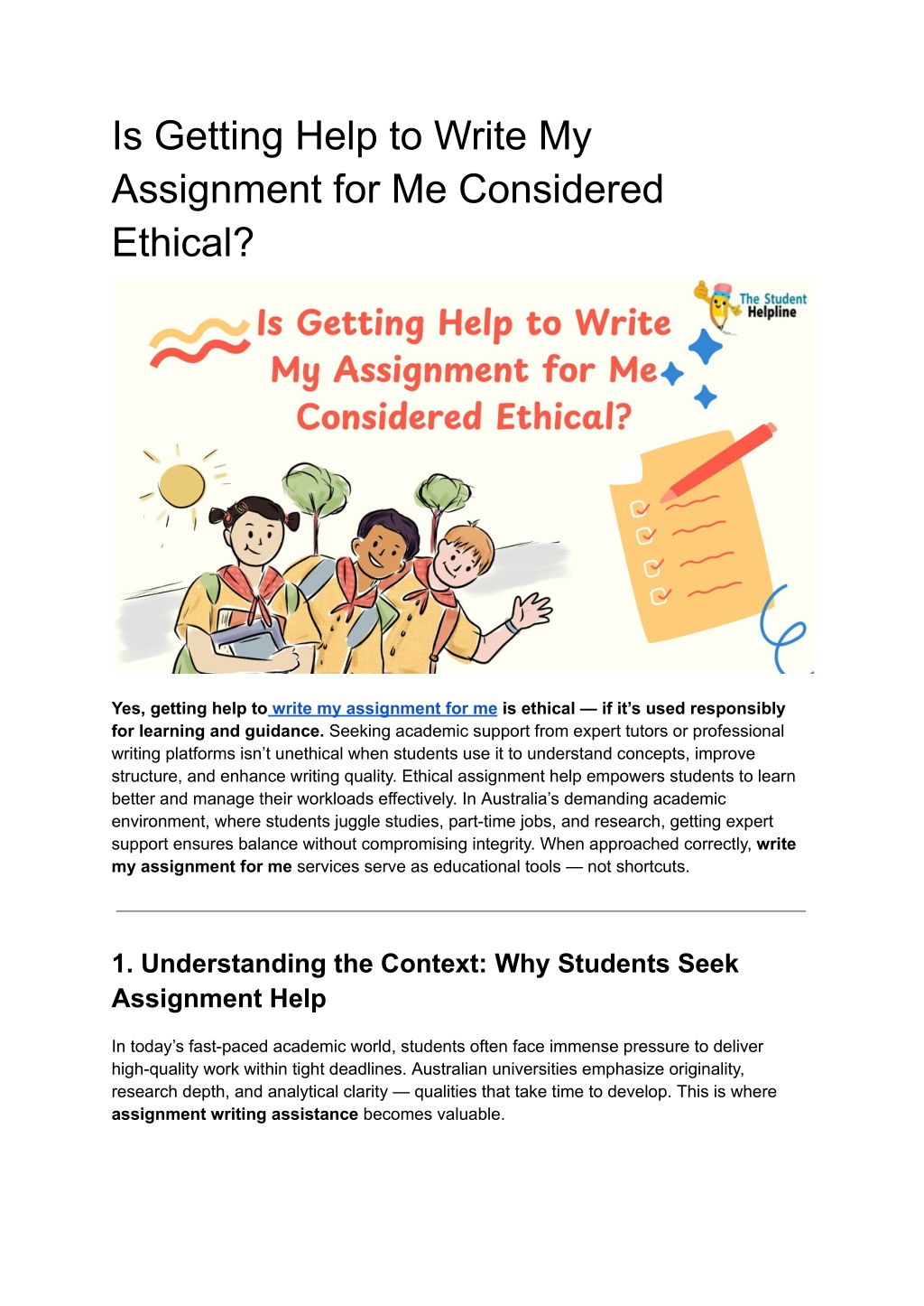 Is Getting Help to Write My Assignment for Me Considered Ethical? Yes, getting help to write my assignment for me is ethical — if it’s used responsibly for learning and guidance. Seeking academic support from expert tutors or professional writing platforms isn’t unethical when students use it to understand concepts, improve structure, and enhance writing quality. Ethical assignment help empowers students to learn better and manage their workloads effectively. In Australia’s demanding academic environment, where students juggle studies, part-time jobs, and research, getting expert support ensures balance without compromising integrity. When approached correctly, write my assignment for me services serve as educational tools — not shortcuts. 1. Understanding the Context: Why Students Seek Assignment Help In today’s fast-paced academic world, students often face immense pressure to deliver high-quality work within tight deadlines. Australian universities emphasize originality, research depth, and analytical clarity — qualities that take time to develop. This is where assignment writing assistance becomes valuable.